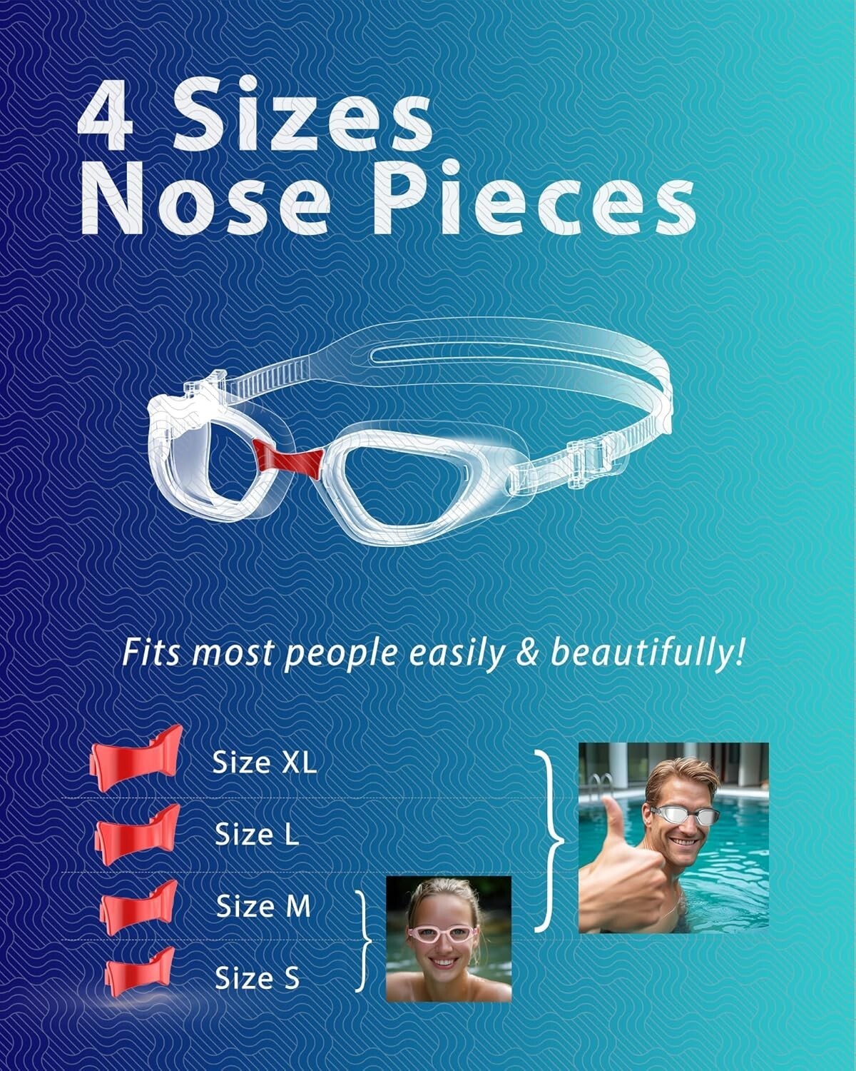 Experience superior comfort and clarity with our perfect size swimming goggles designed for adult men and women. Featuring four sizes of nose pieces, these goggles easily fit different head shapes, including larger sizes for bigger heads, ensuring a secure, leakproof fit. The ergonomic 3D sealing with soft silicone provides optimal comfort and a snug, leakproof seal. Equipped with high-performance curved lenses offering 180+ wide-view visibility, anti-fog coating, and UV 400 protection, these goggles deliver crystal-clear vision indoors and in low-light conditions. Built to last with impact-resistant PC lenses and tear-resistant silicone, they withstand rigorous use. Enjoy effortless adjustments with easy-to-change nose pieces and adjustable straps. For a seamless swimming experience, trust ZABERT?s dedicated customer service. Please note: proper sizing is essential for leak-free comfort. To ensure fast and reliable delivery, we work with multiple fulfillment partners and suppliers. Depending on availability and location, your order may ship from different warehouses or arrive in packaging that varies from item to item. Tracking details are typically provided shortly after shipment, and customer satisfaction remains our top priority. Please note that due to carrier policies and regional regulations, certain items may not be eligible for delivery to specific states or territories.