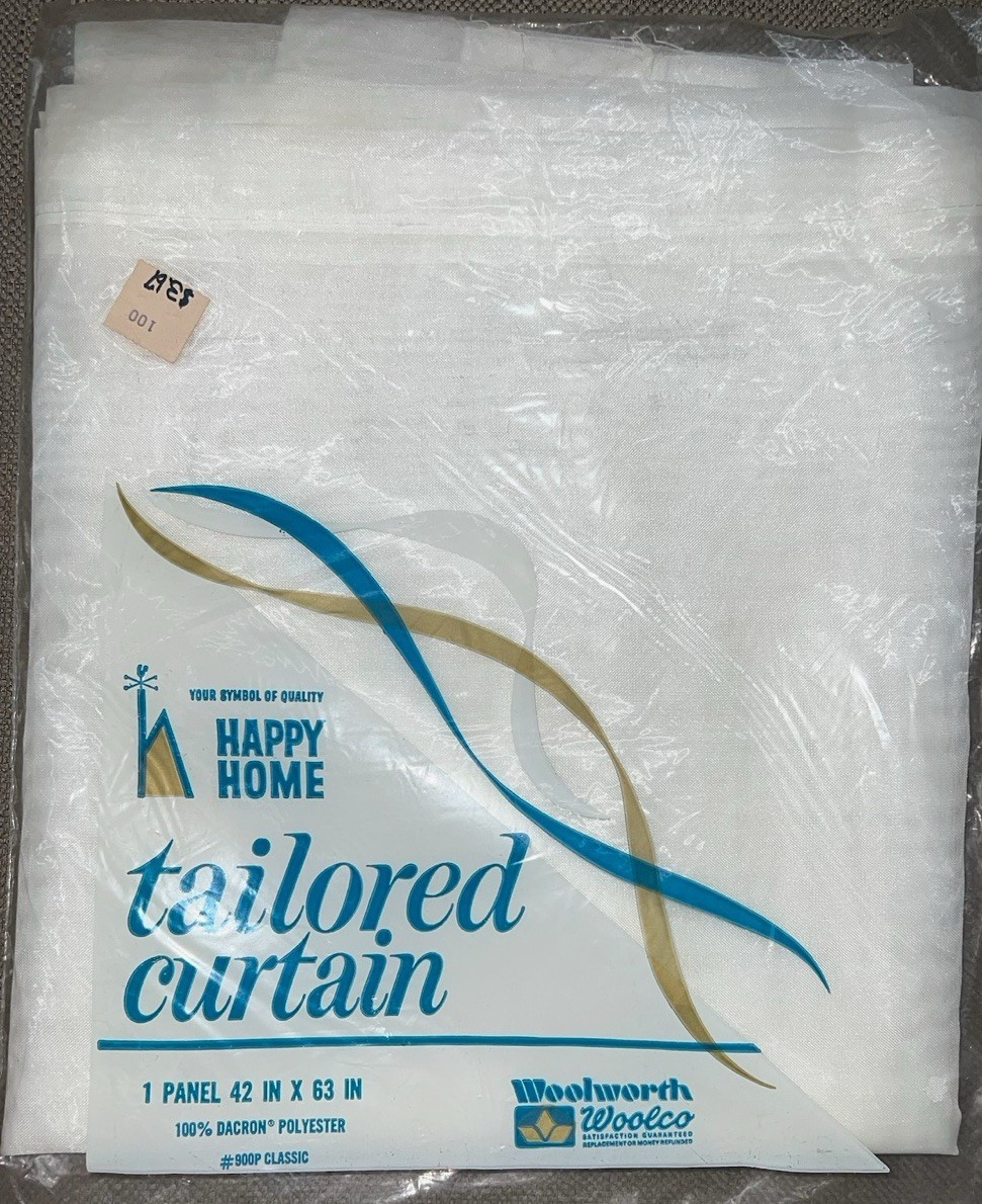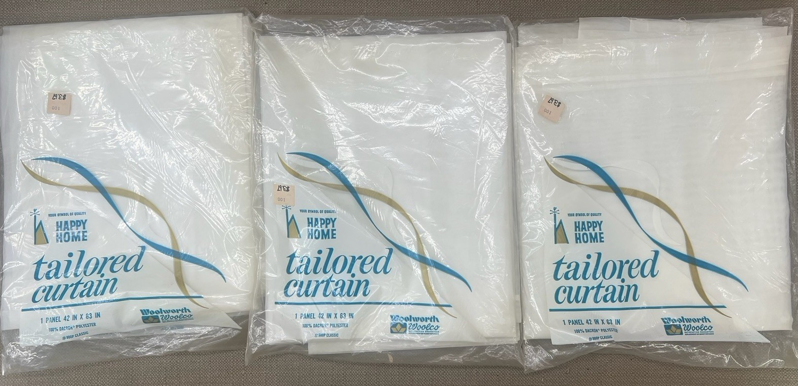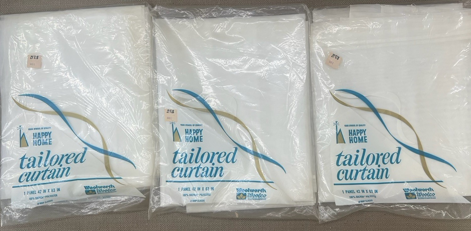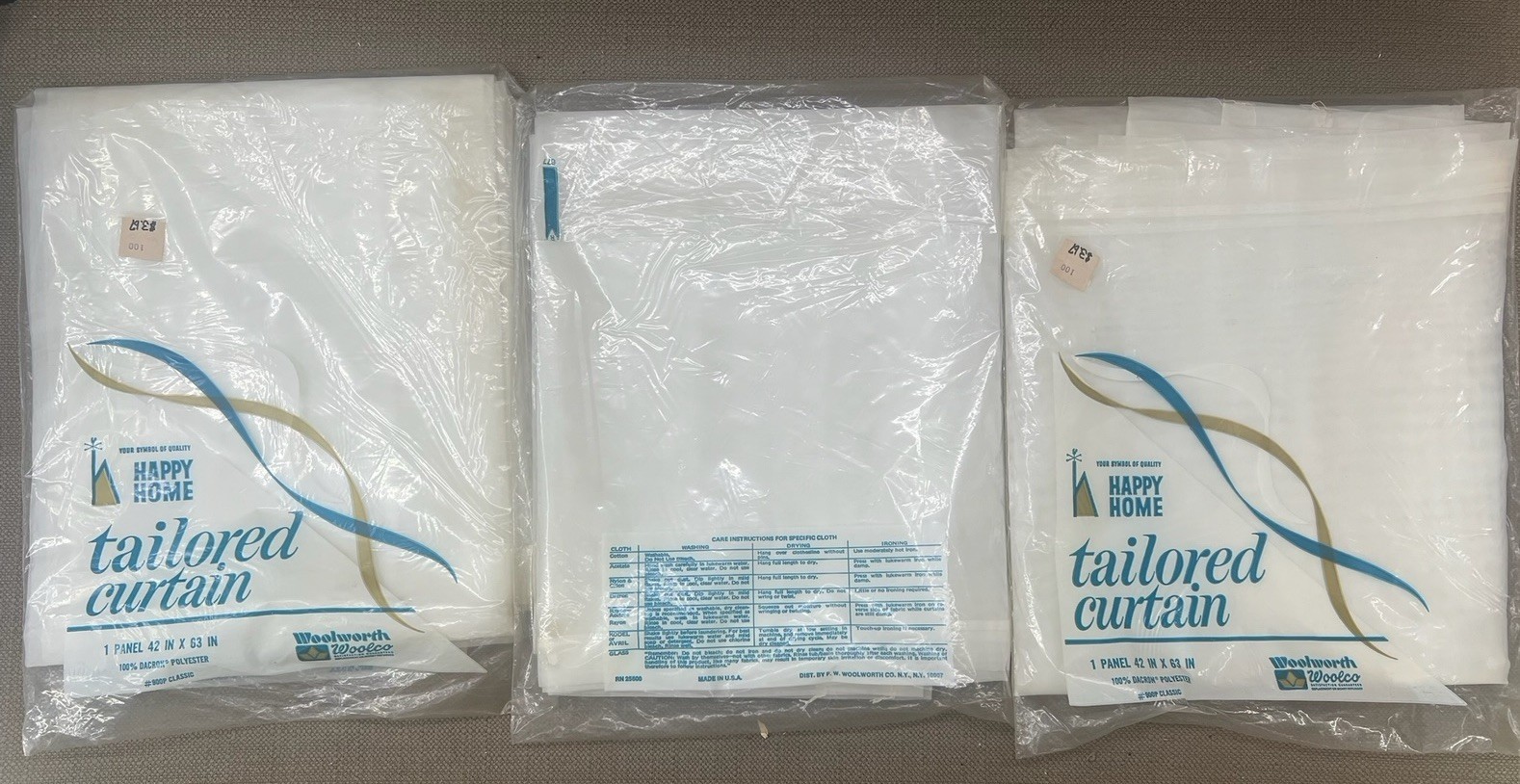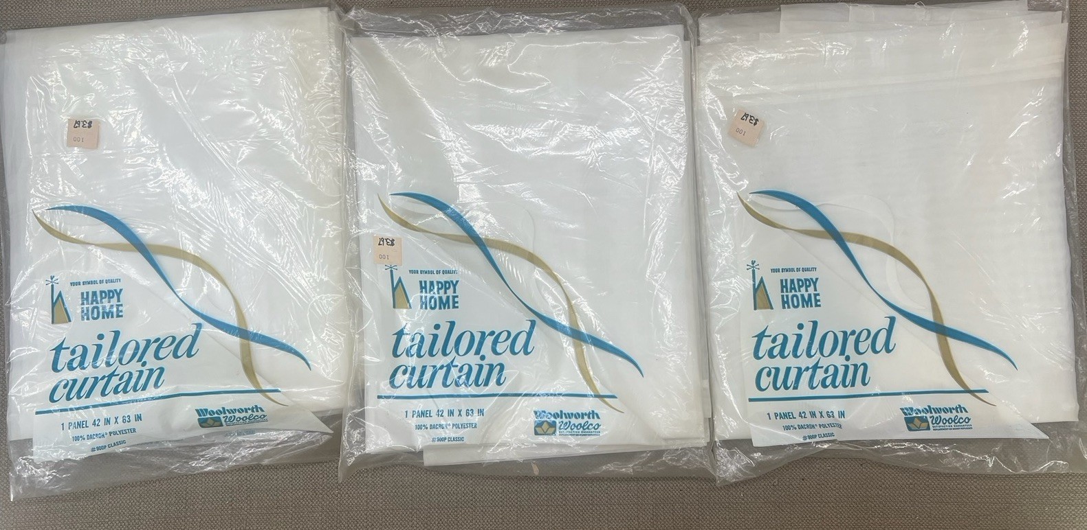 Set of three (3) vintage Woolworth?s ?Happy Home? tailored curtain panels, each measuring 42? x 63?. These New Old Stock (NOS) curtains are factory sealed in original packaging and made of 100% Dacron polyester for that crisp, mid-century look.