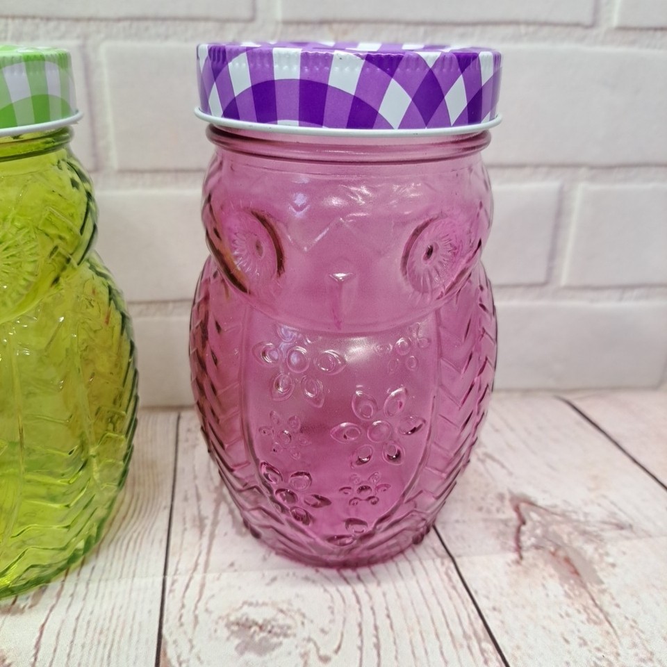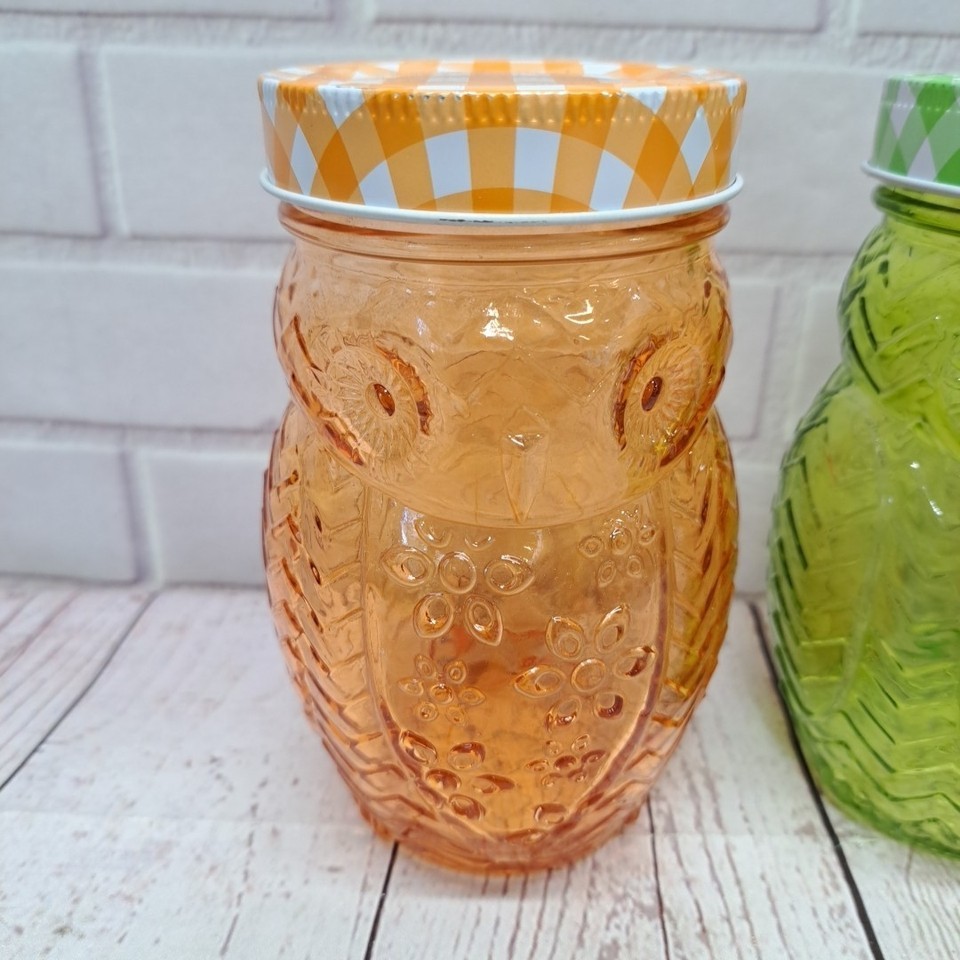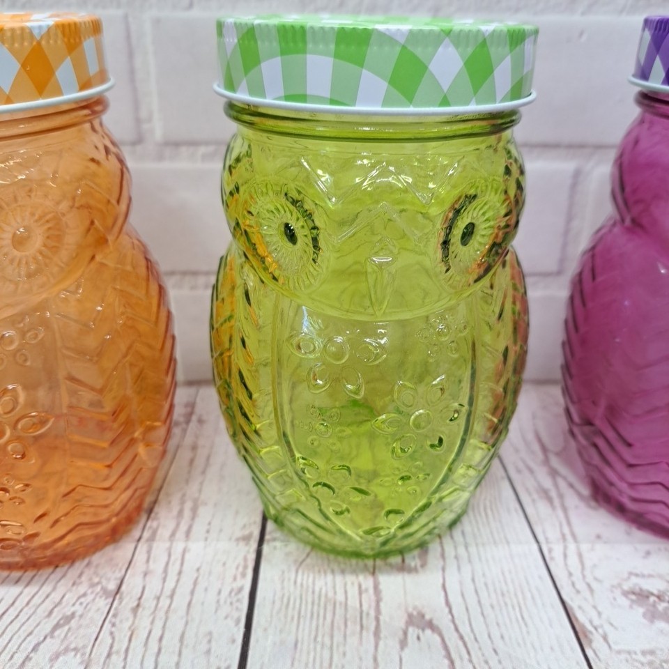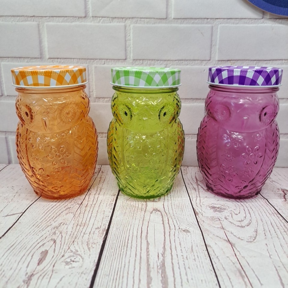 This 3-piece set includes a 5.5" tall 3D glass owl canning jar with matching plaid lids, perfect for all occasions. The farmhouse style design features a unique owl shape and pattern, making it a charming addition to any kitchen or dining area. Made of glass and weighing 11.6 oz, this drinking jar set is ideal for serving 3 people and adds a touch of nature and animal-themed decor to your home.