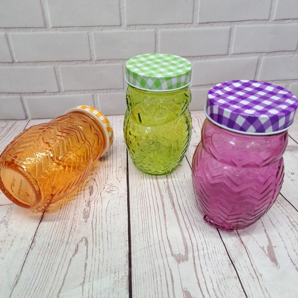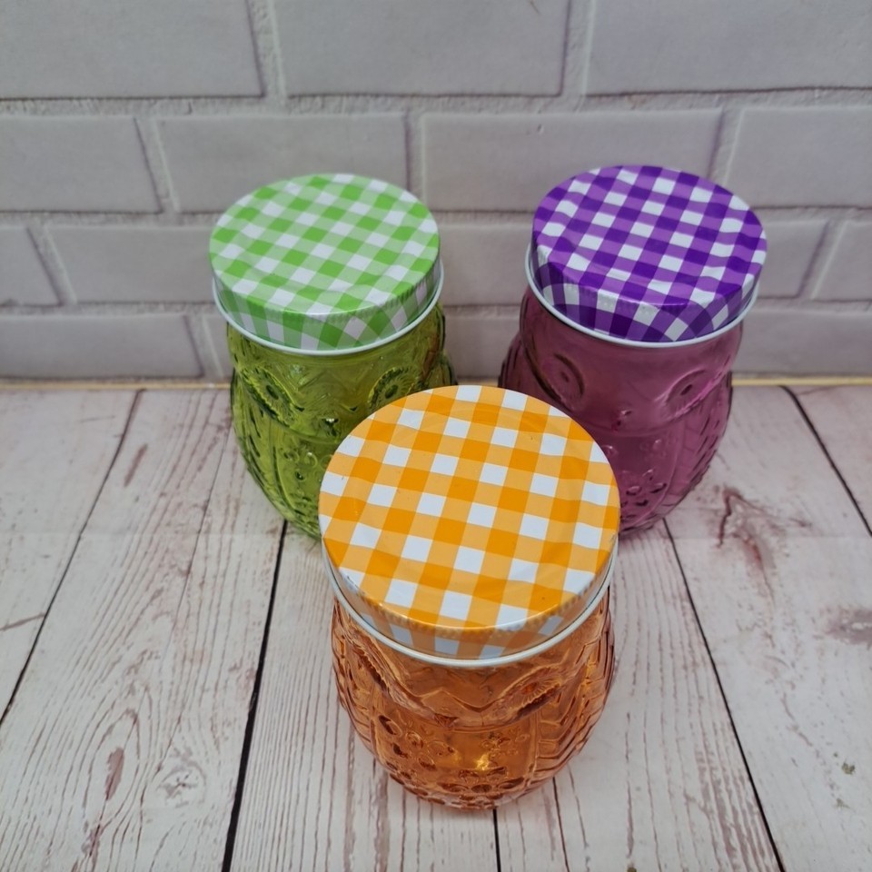 3D Glass Owl Canning Jar Glass Mason 5.5" Tall with Matching Plaid Lids, 3pc Set