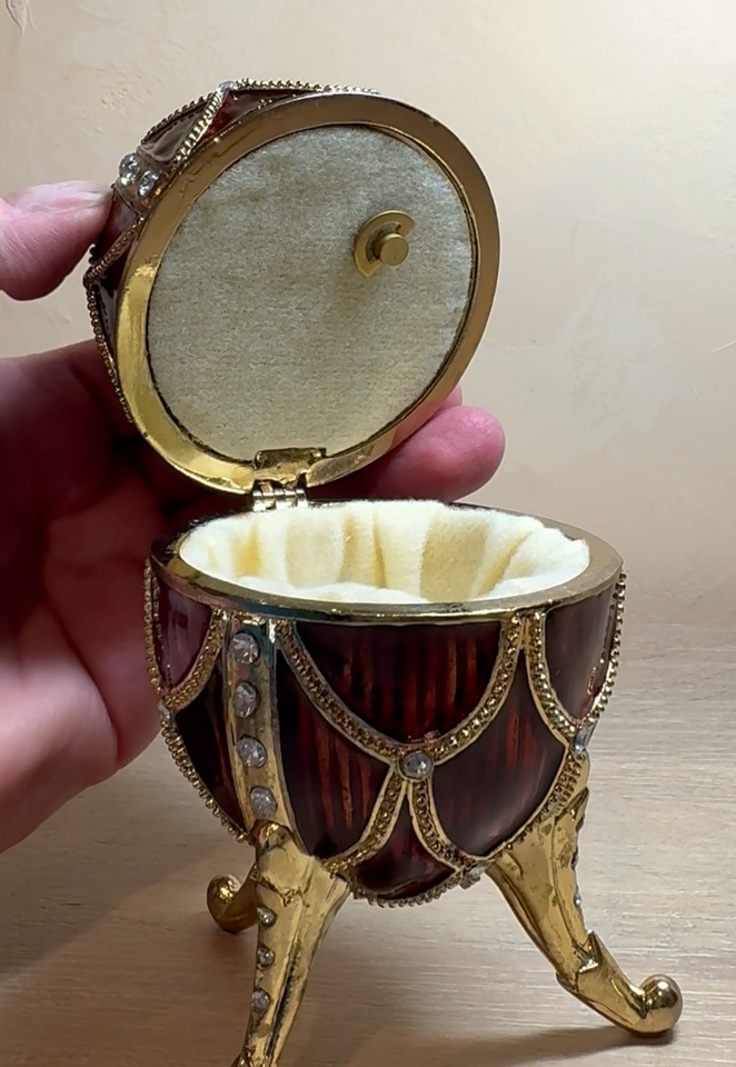 Rouge- With faux gold tripod legs holding the ornate crimson red and faux gold egg, our Rouge egg is adorned with intricate designs and faux gems. This egg also opens to hold your tiny treasures