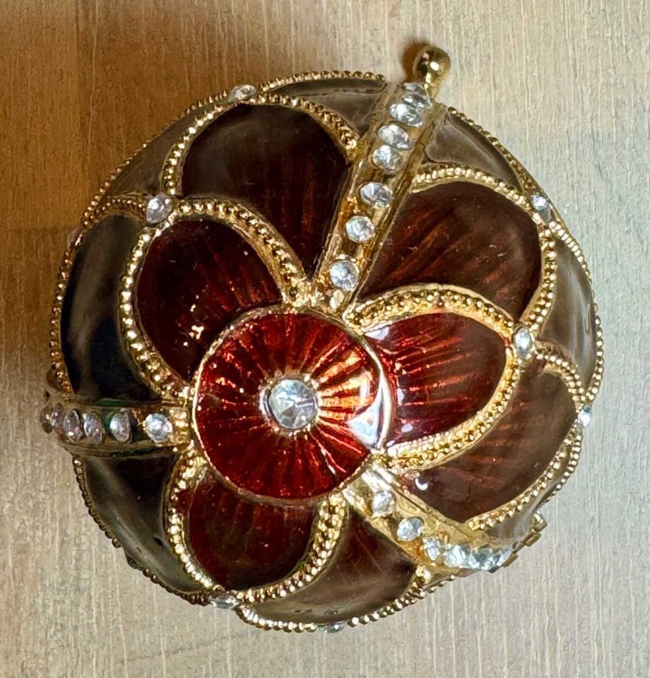 High Quality Collectable Egg - Hand-cast in a pewter alloy using the ancient lost wax method, our collectable egg is topped with brilliant crimson red enamel, faux jewels, and tiny trellis embellishments