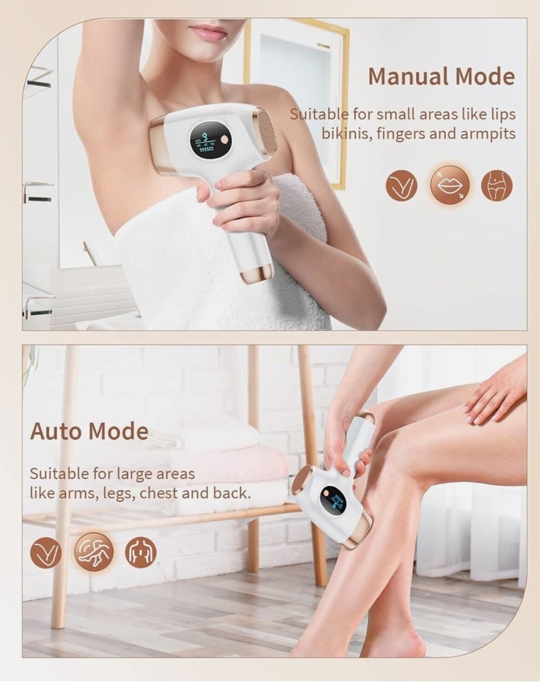 ? 2 Modes 9 Power Levels: JOOYEE laser hair removal has 9 adjustable energy levels and 2 modes to accommodate different skin sensitivities.The automatic mode can be used for larger areas of hair removal, such as arms, legs,back; the manual mode is mainly used for small areas of hair removal, such as bikini line, armpit, lips.