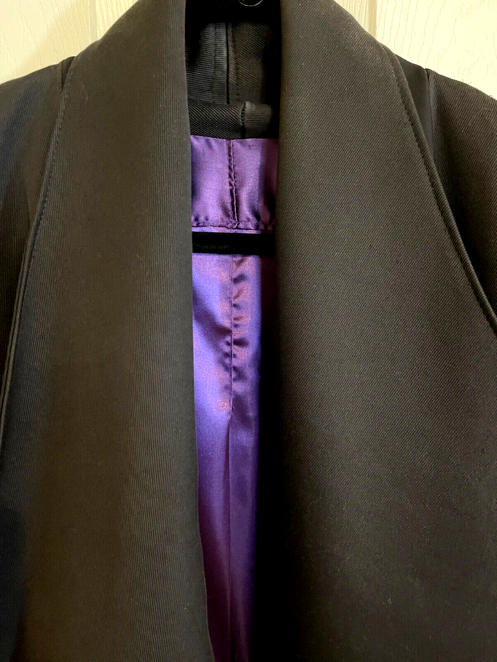Elegant full length flowing coat. Striking lapels, inverted back pleat, slit pockets and purple satin lining. This coat will take you everywhere!