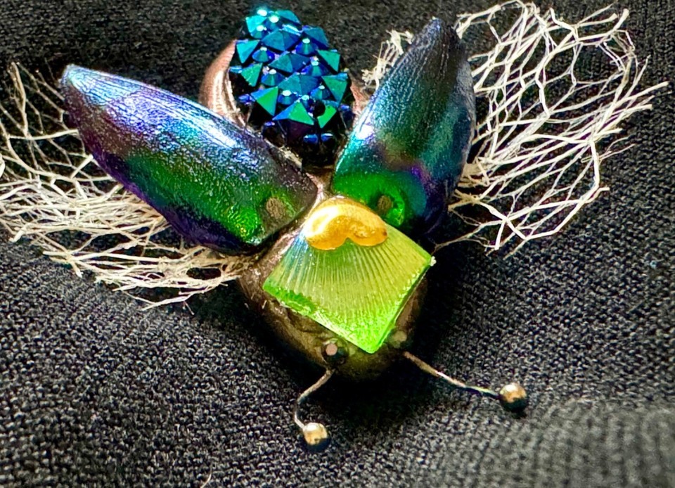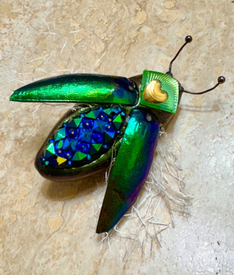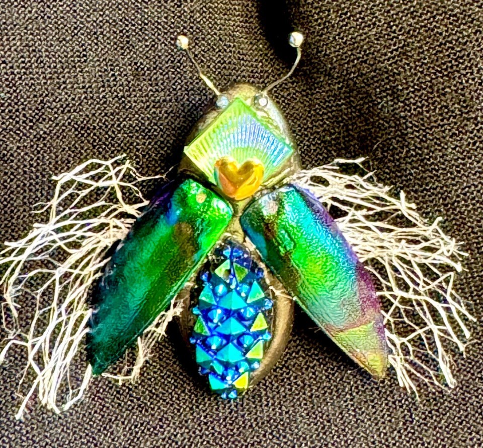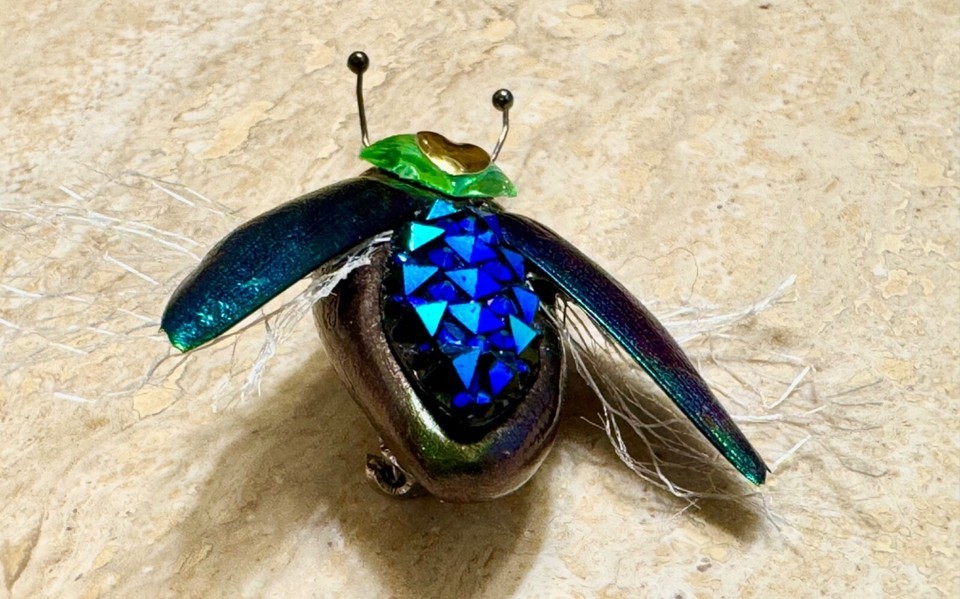 The beetle's outer wings are real beetlewing casings. Other materials used as follows: