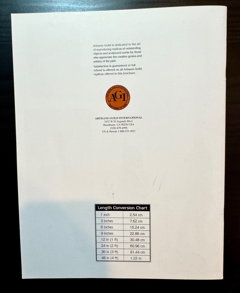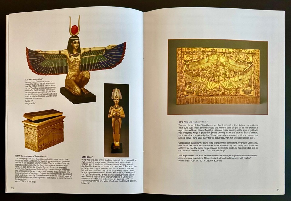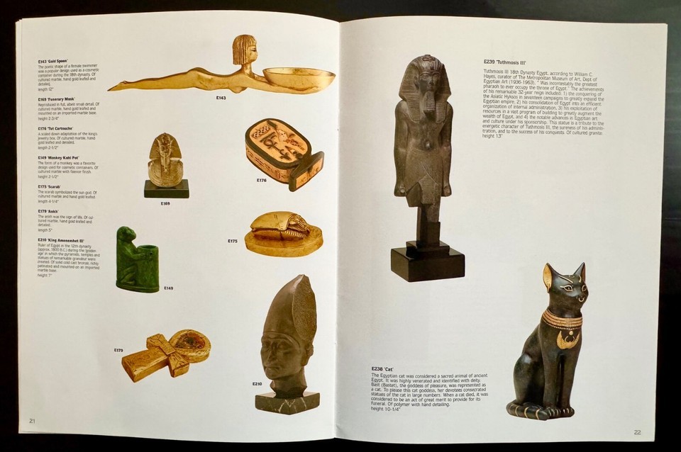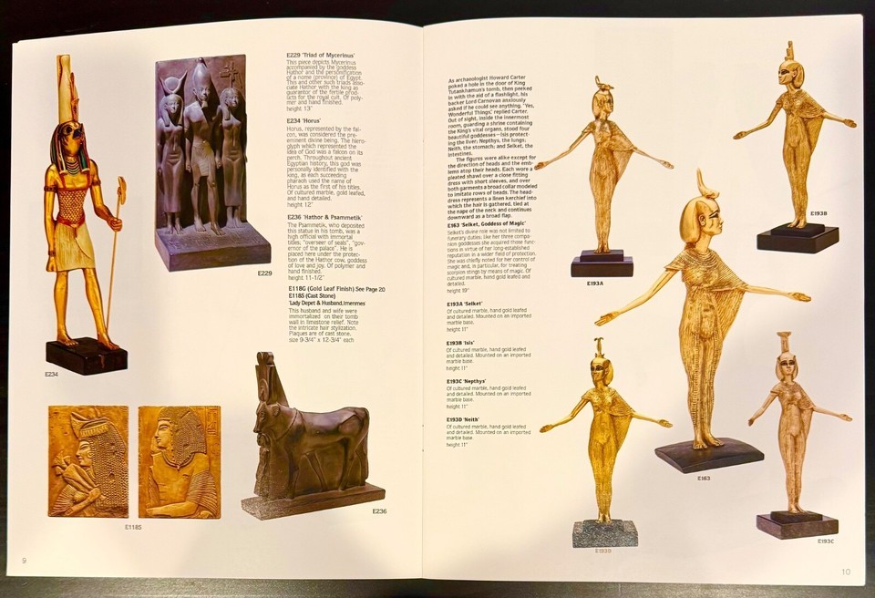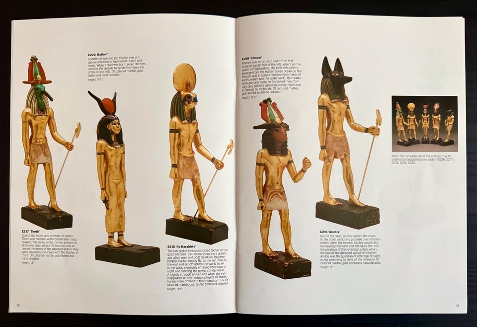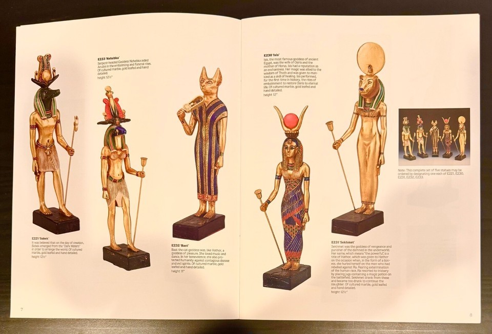 Difficult to find Artisans Guild International AGI Catalog from 1998 featuring the finest Egyptian statue reproductions such as Isis, Hathor, Bast, Set, Osiris, Thoth, Amun-Ra, Maat, Anubis and may other art works.