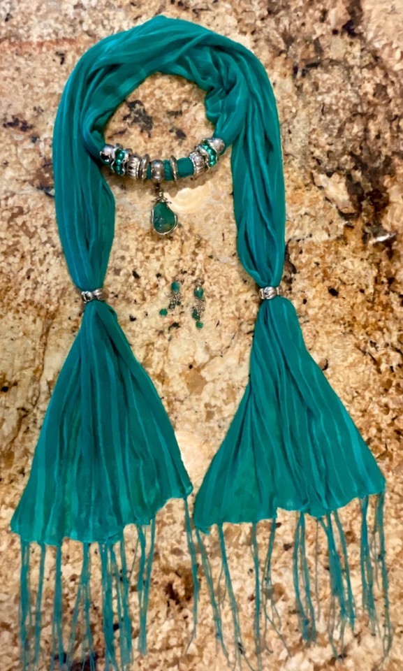 Artisan made splendid scarf necklace and earrings. 63" long to gracefully drape over your shoulders.