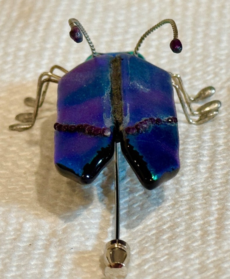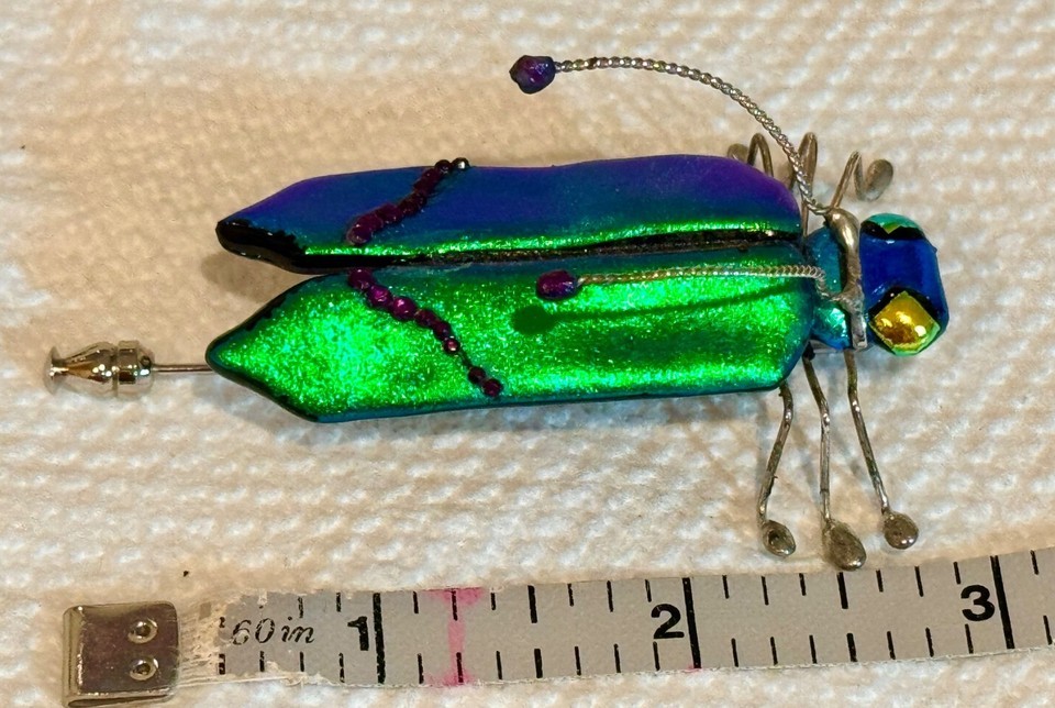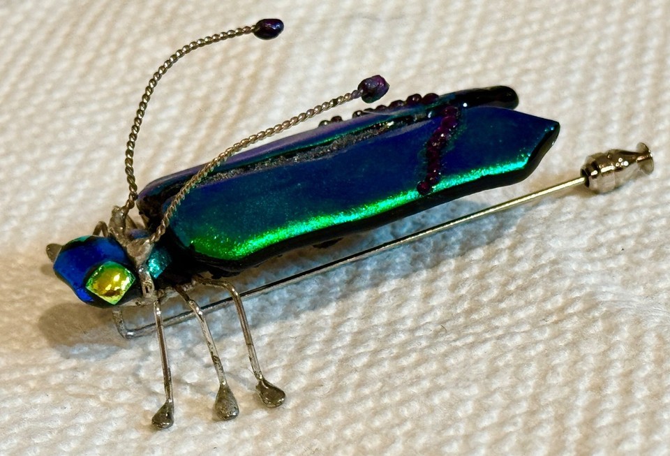 This Exceptional Artisan Dichroic Glass Blue Green Beautiful Bug 3" Stick Pin features a unique and vibrant design, perfect for adding a pop of color to any outfit.