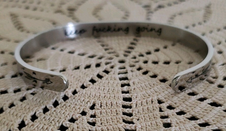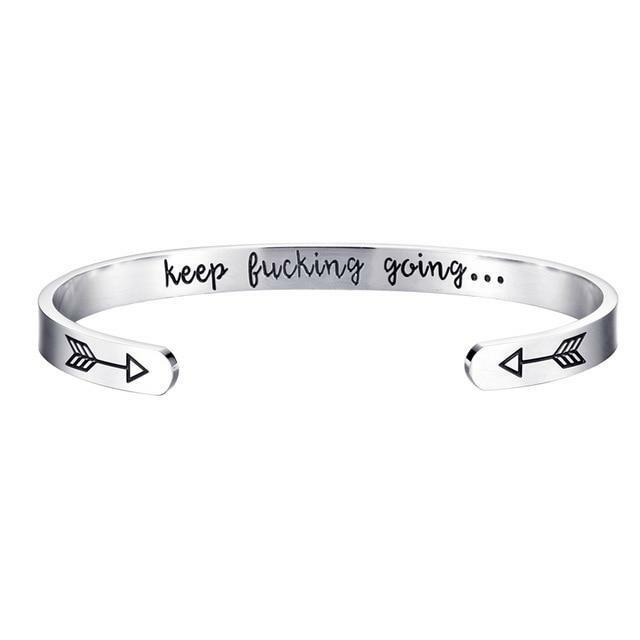 "Keep Fucking Going" printed on the inside of bracelet with two arrows at each side of outside opening
