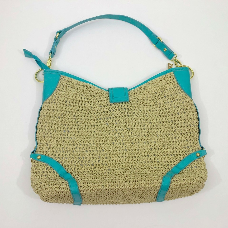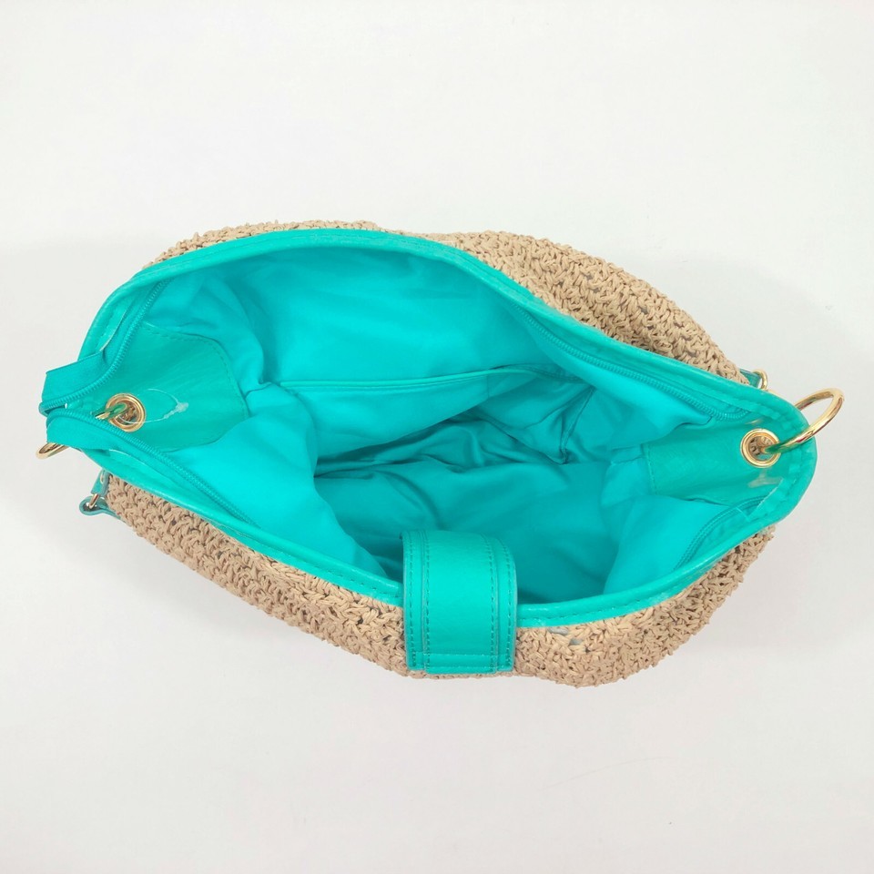 Moda Turquoise Faux Leather Woven Straw Shoulder Bag 14x10x3.5 inches