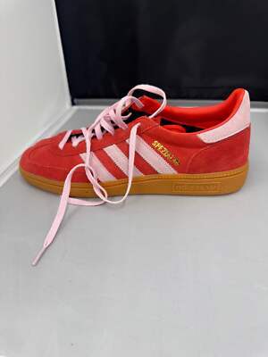 Adidas Handball Spezial Bright Red Clear Pink Women's ( Used No Box ) Classic Adidas Gazelle sneakers in a vibrant red suede with white stripes and a gum sole. These are pre-owned and show light signs of wear but are still in good overall condition with plenty of life left.