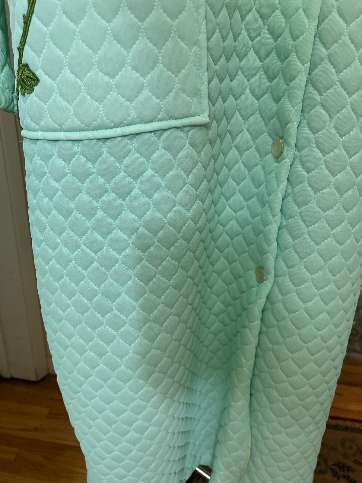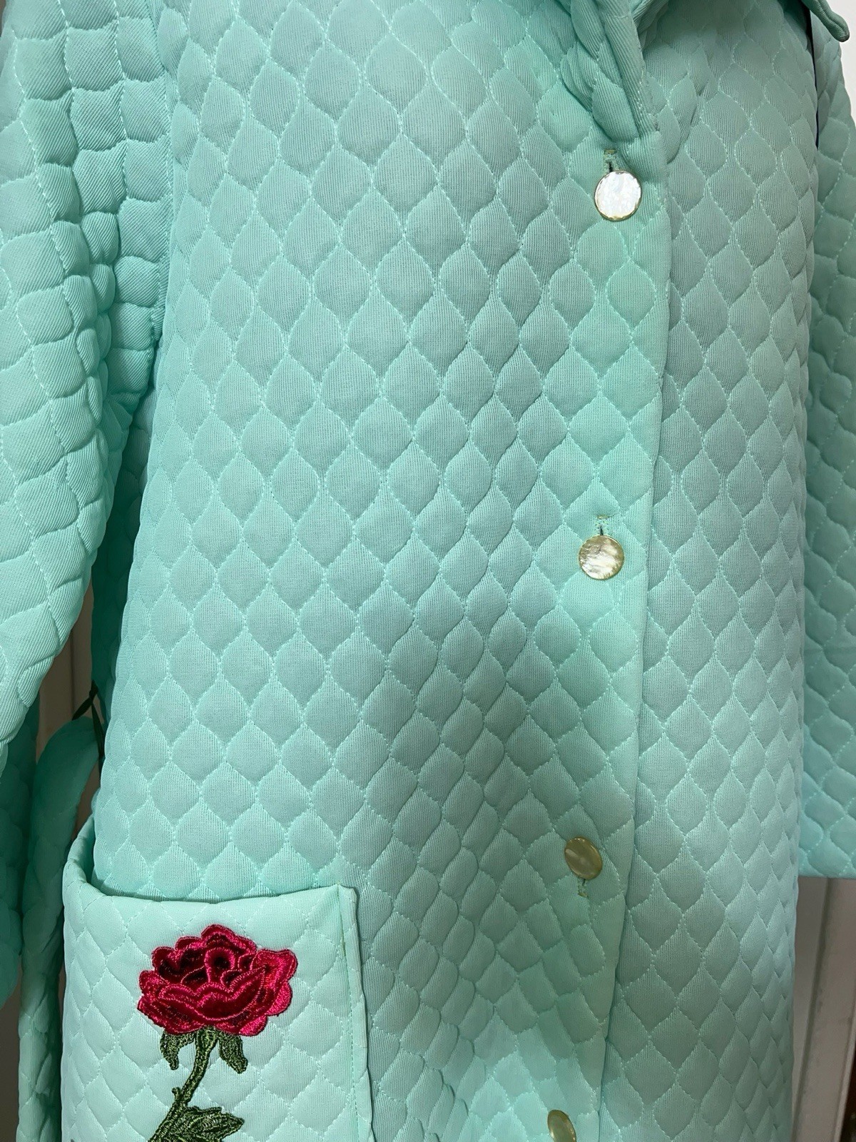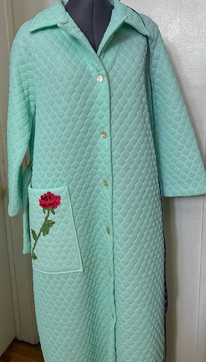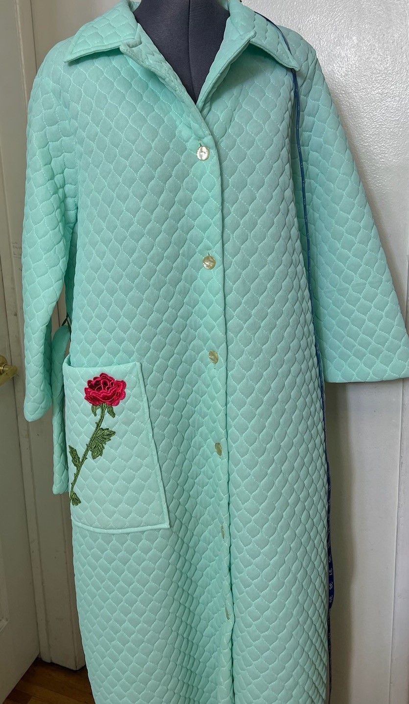 Elegant vintage full-length quilted housecoat in a soft aqua blue/turquoise hue with a stunning red rose applique pocket detail. Features mother-of-pearl style buttons, wide collar, and diamond quilted pattern for that classic mid-century charm. Made of 100% nylon shell with Kodel poly wadding?warm, lightweight, and timelessly chic.