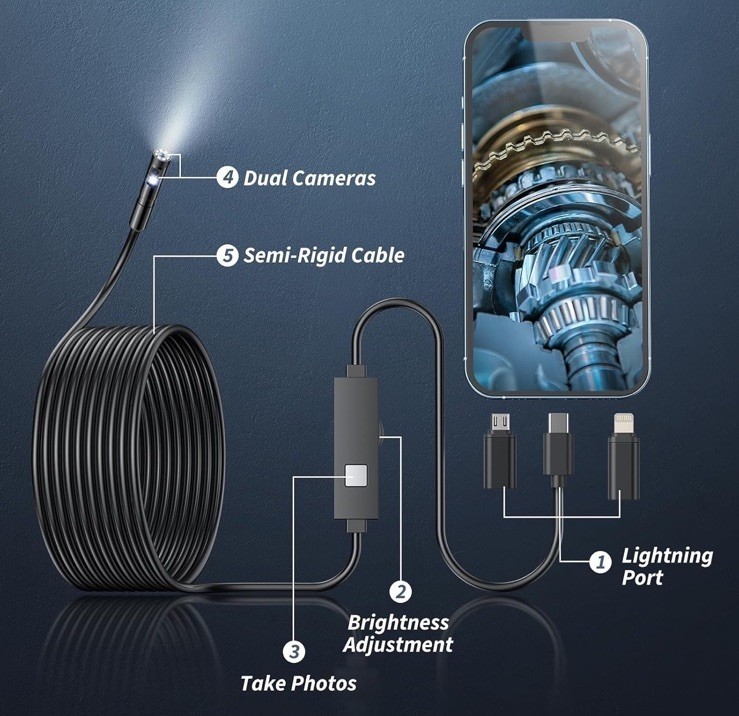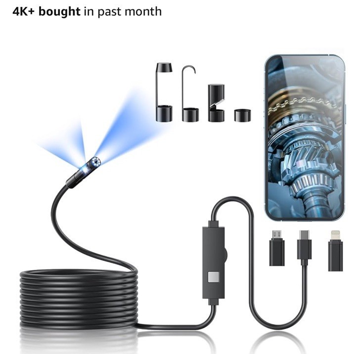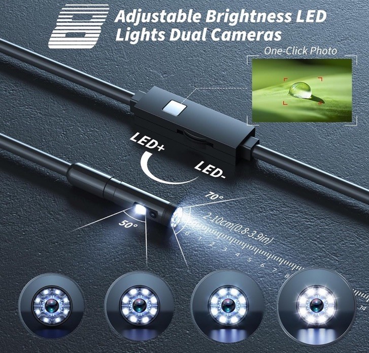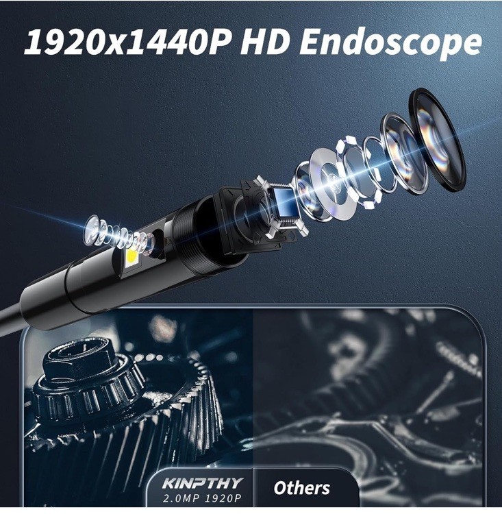 The Endoscope Camera with Light by Kinpthy offers high-quality 1920P HD borescope tools with 8 adjustable LED lights for clear viewing. It is compatible with both iOS and Android devices, with a 16.4ft size and a compact design making it easy to use. This dual-lens camera features manual exposure control, digital zoom, and a CMOS sensor for precise imaging. The package includes an SD card for media storage, and the camera does not use a flash for enhanced video capture resolution. With a fixed focus and LCD screen viewfinder, this endoscope camera is ideal for various inspection needs.