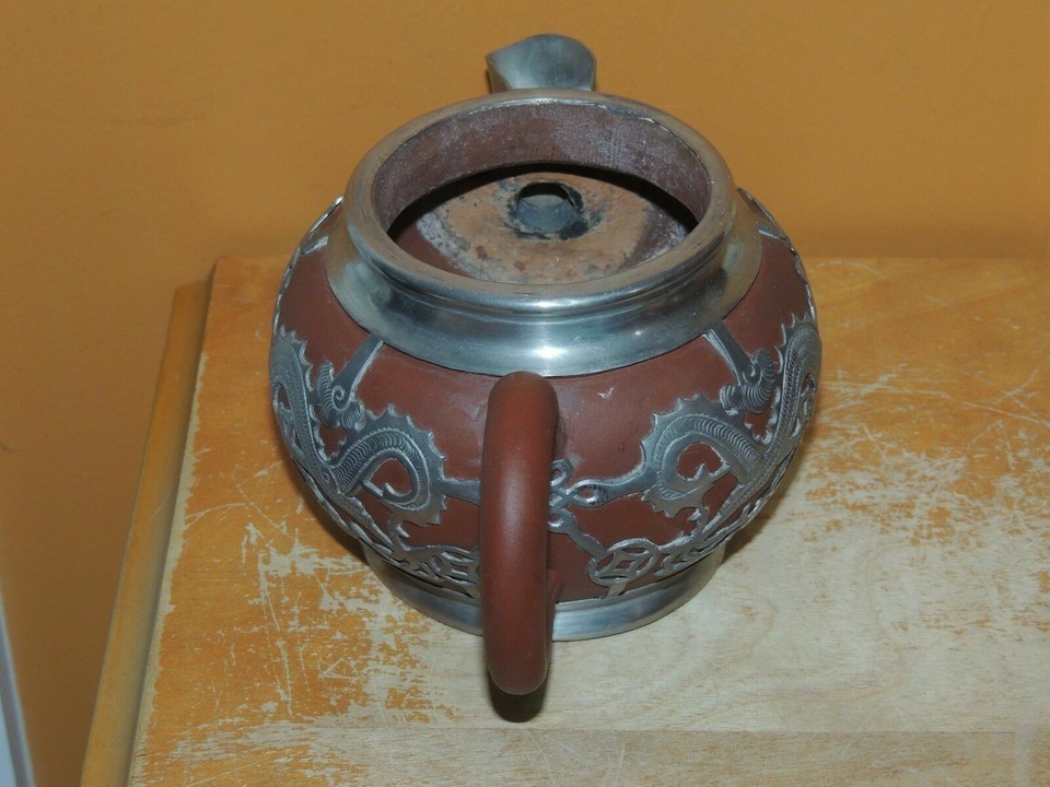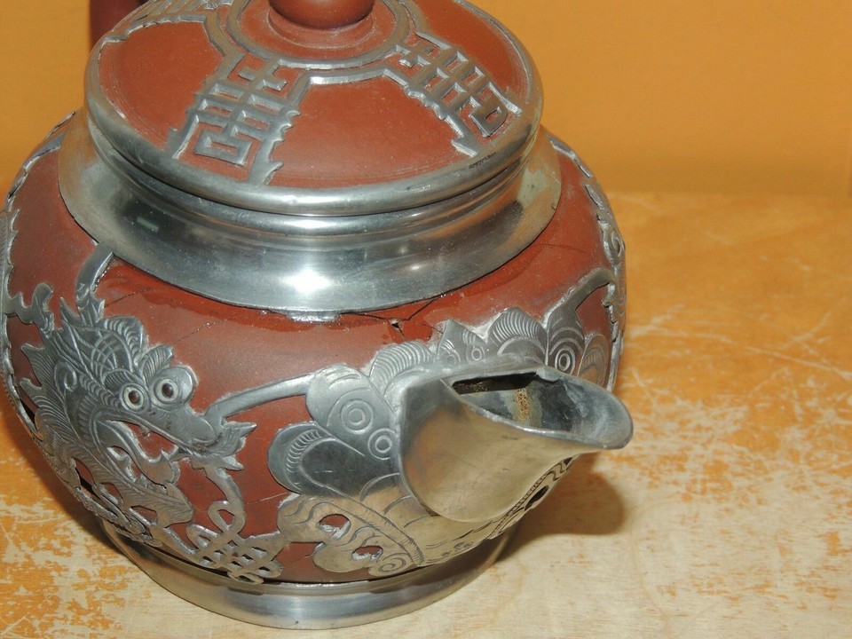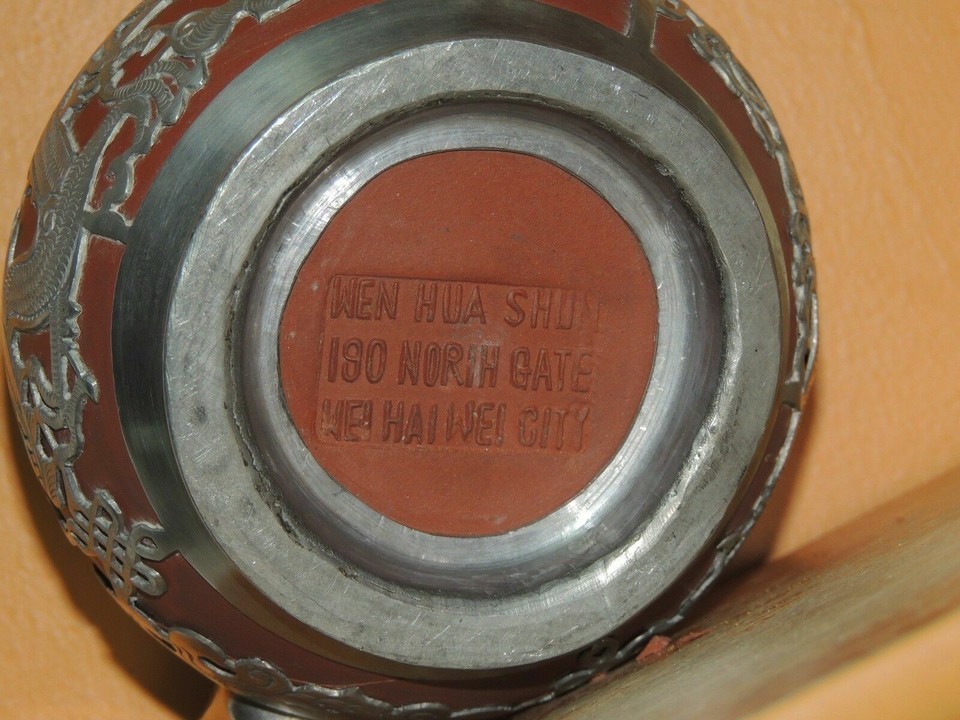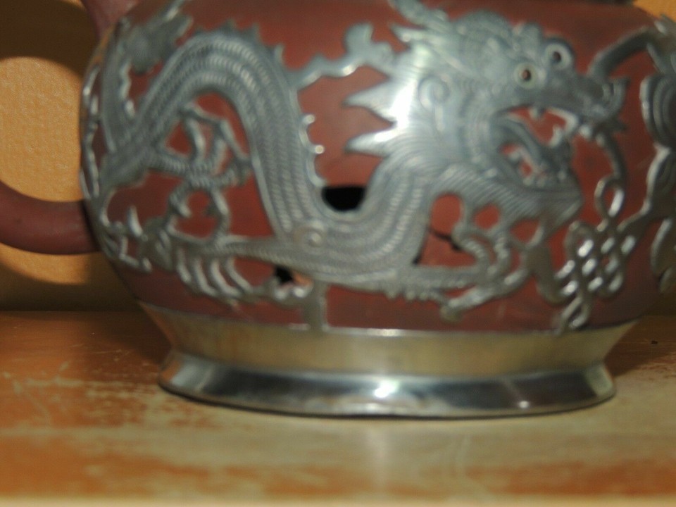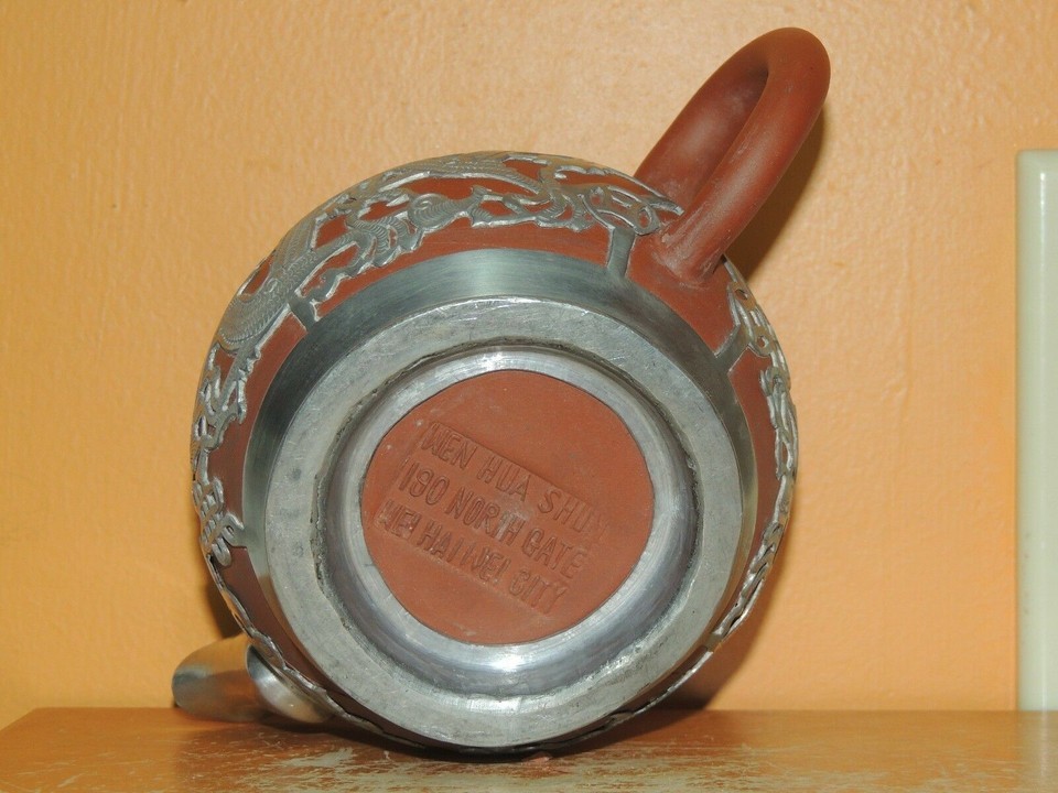 Antique Chinese 4.5" Yixing Zisha Creamer pewter dragon Wen Hua Shun Wei Hai