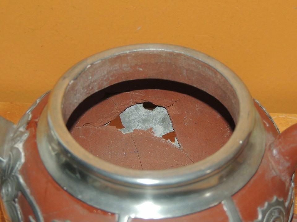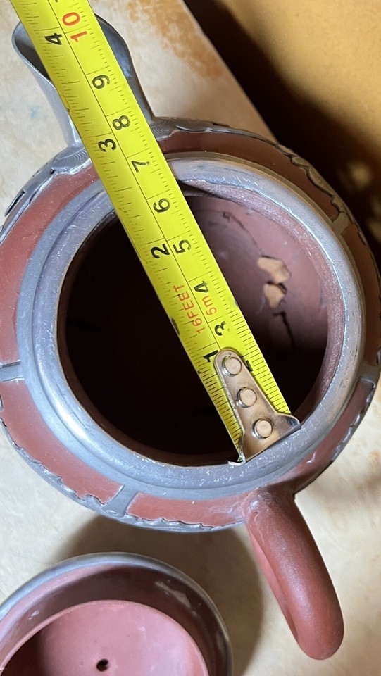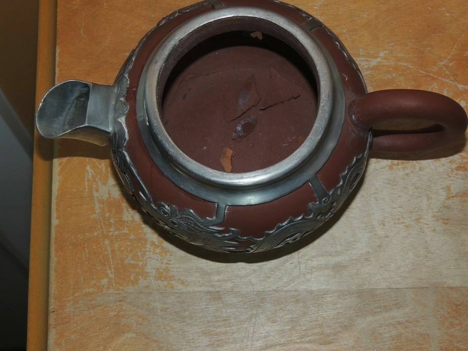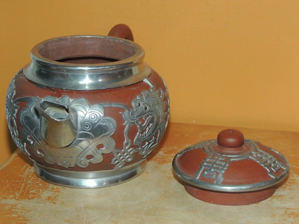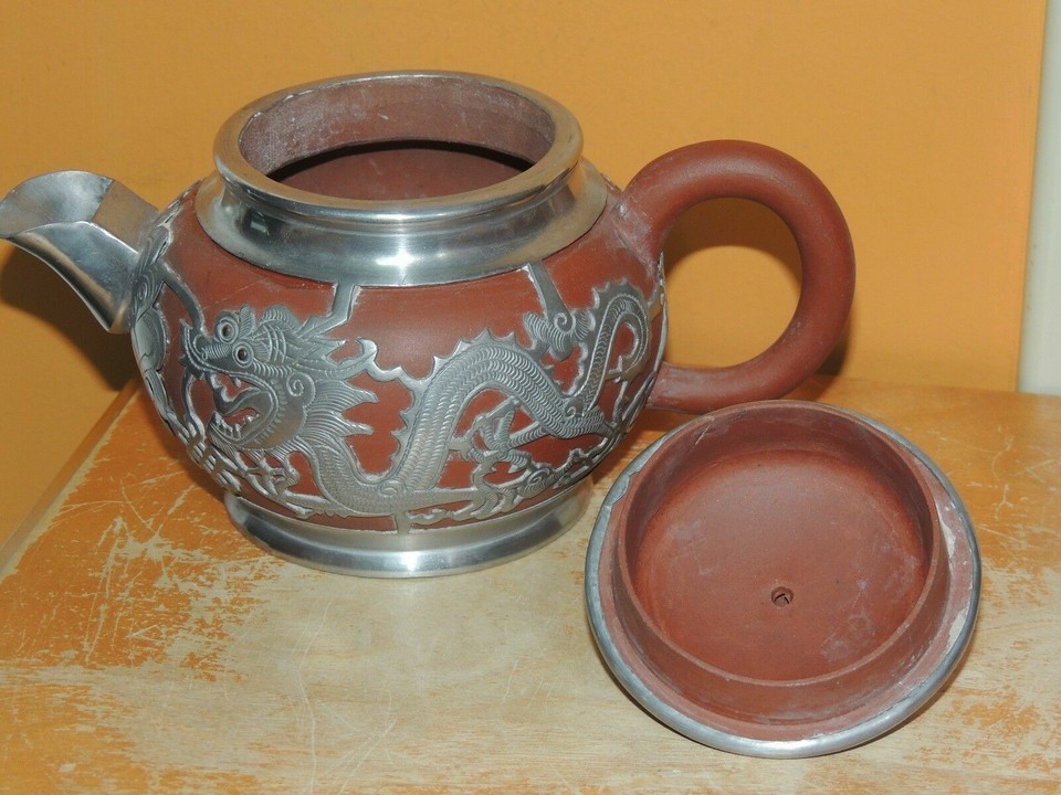 Antique Chinese 4.5" Yixing Zisha Creamer pewter dragon Wen Hua Shun Wei Hai