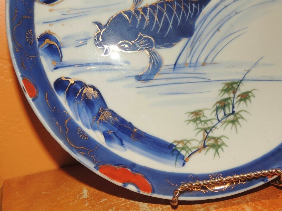 Large Round Chinese Charger/ Plate 10.5" Fish Koi Carp Blue White Qing/ Republic