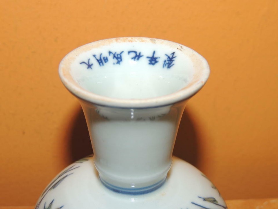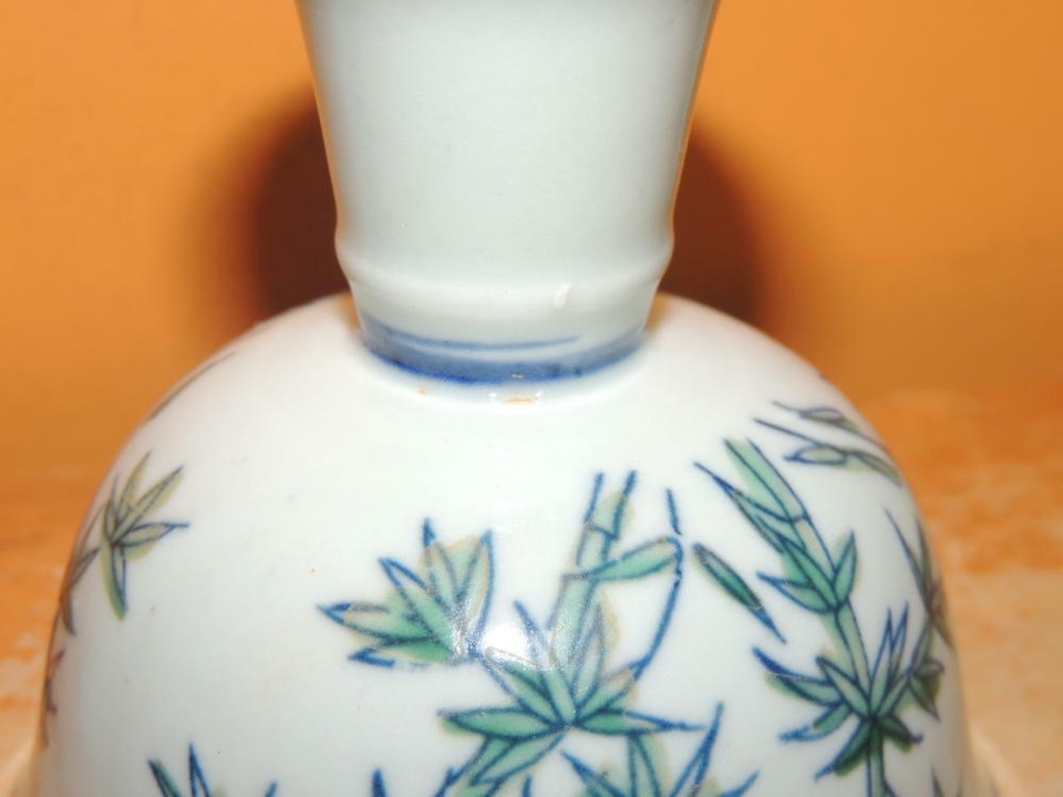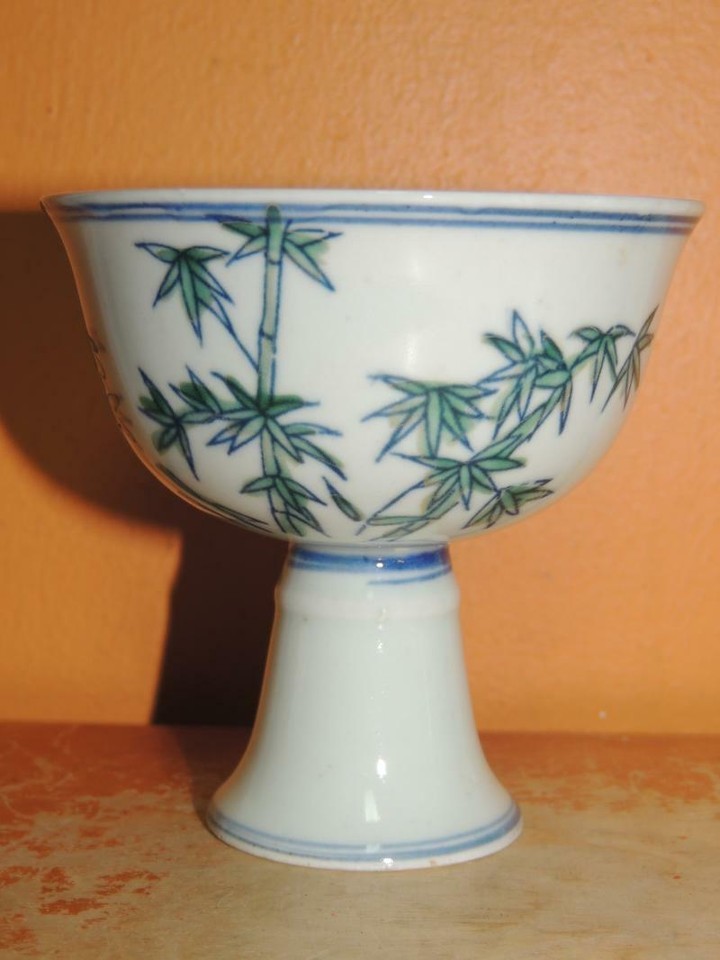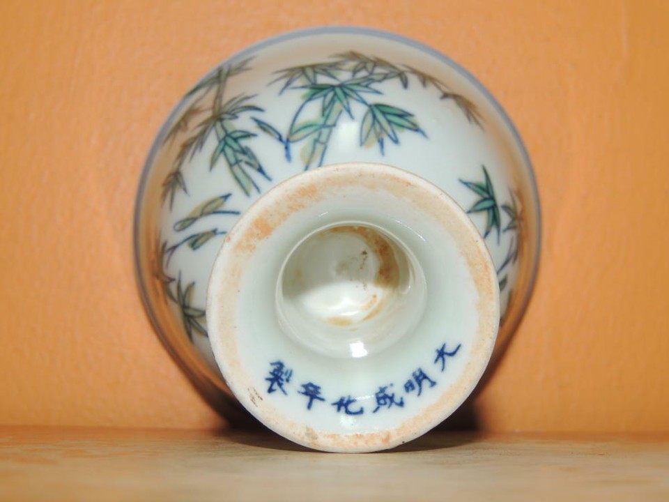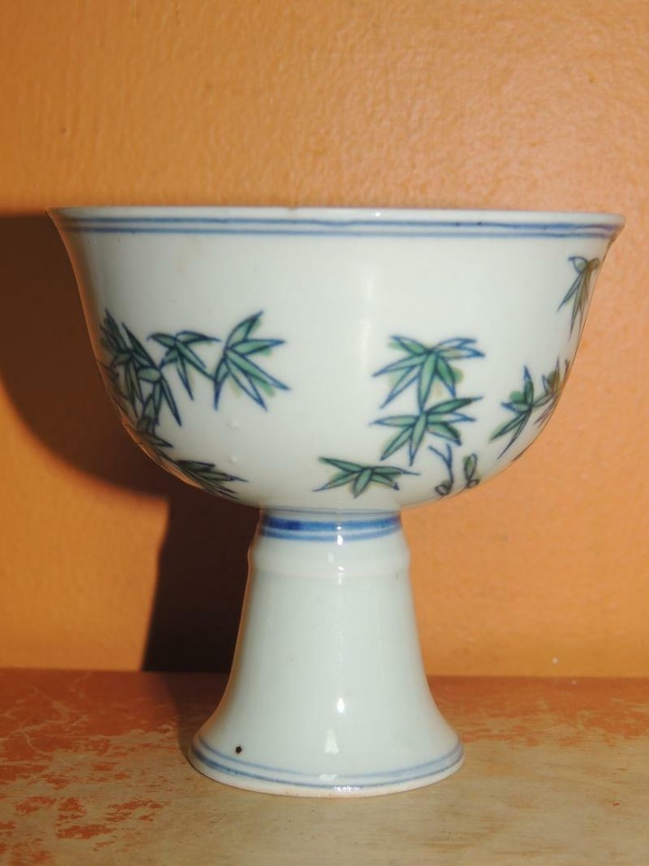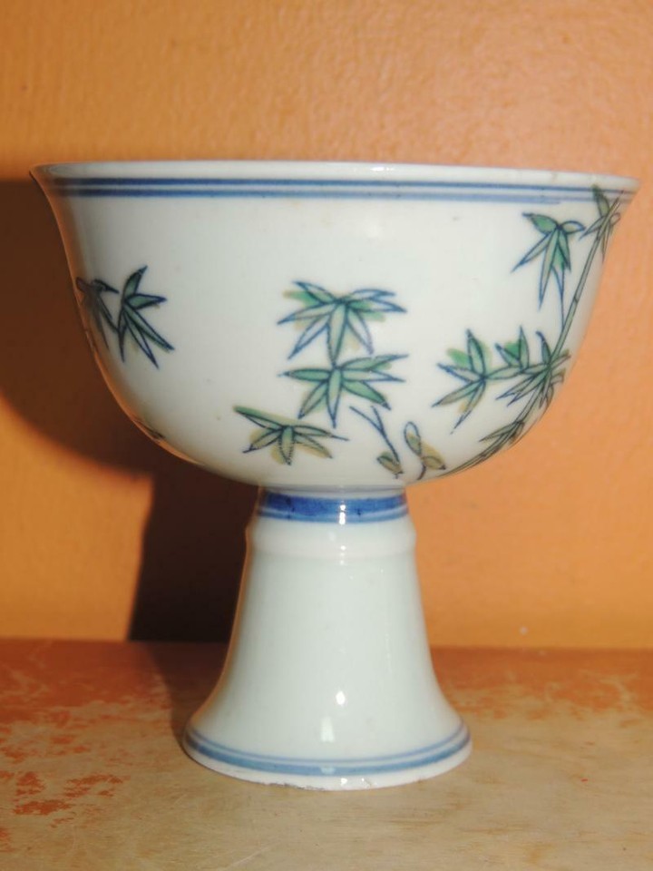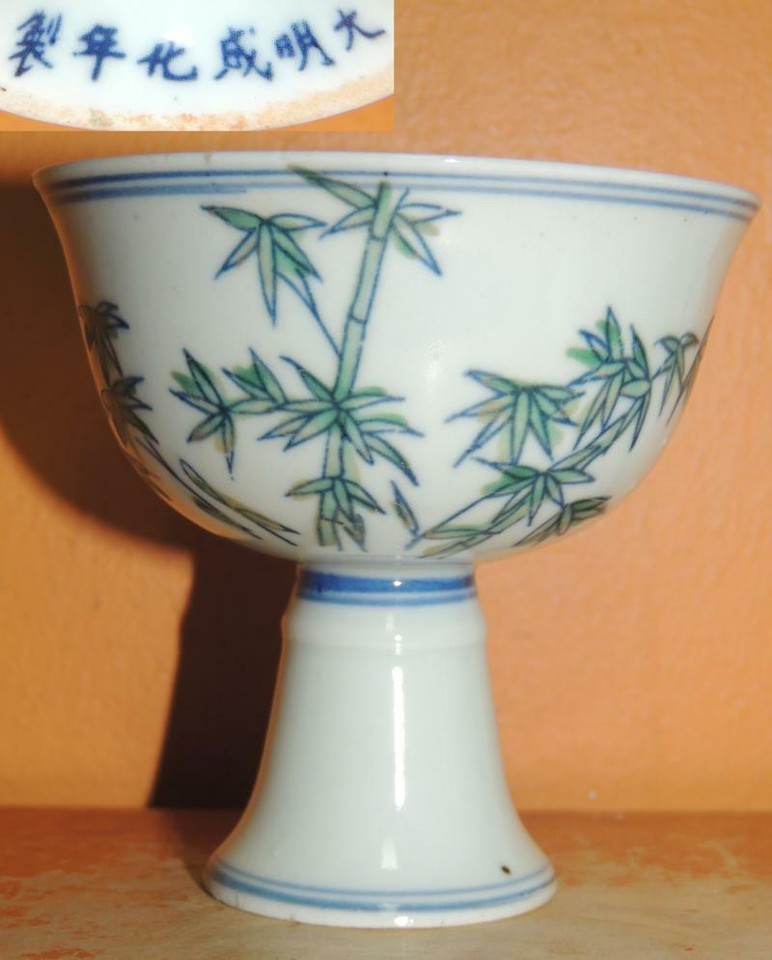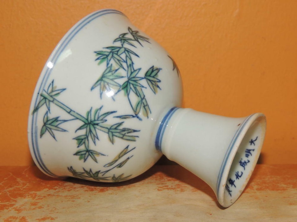 Chinese Stem Cup 3.25 bamboo blue white green marked Ming Chenghua Antique Vintg
