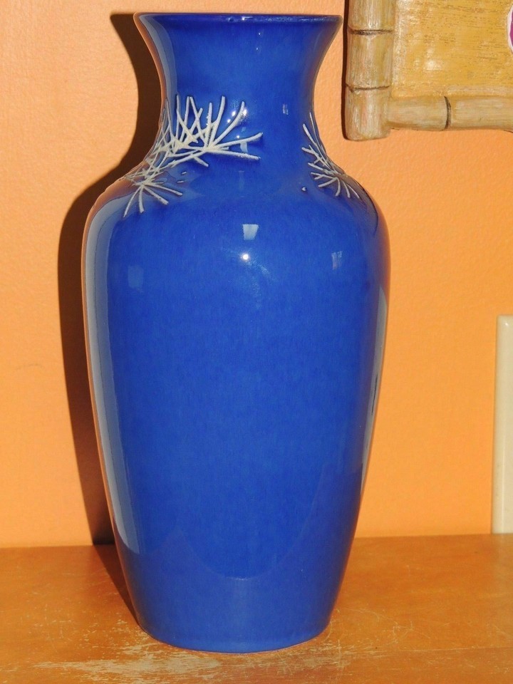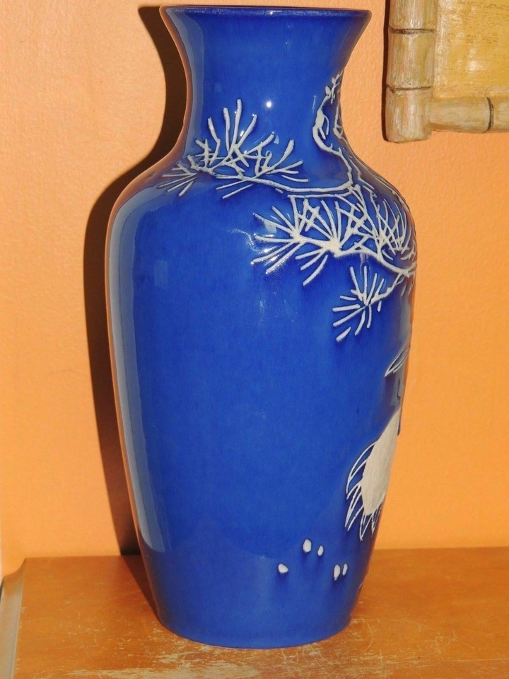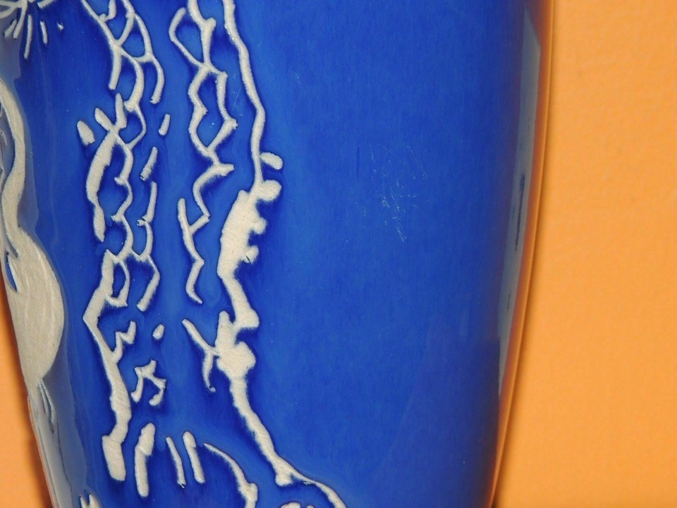 Sgraffito 10" Vase Crane design scratched into Royal Blue glaze Hand Made