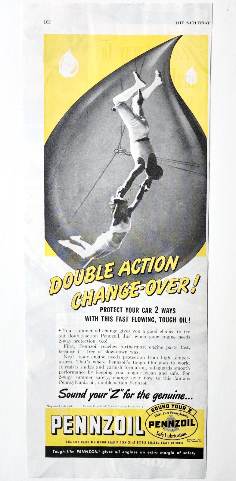 1947 Pennzoil Motor Oil Advertisement Flying Trapeze Double Action DWJJ23