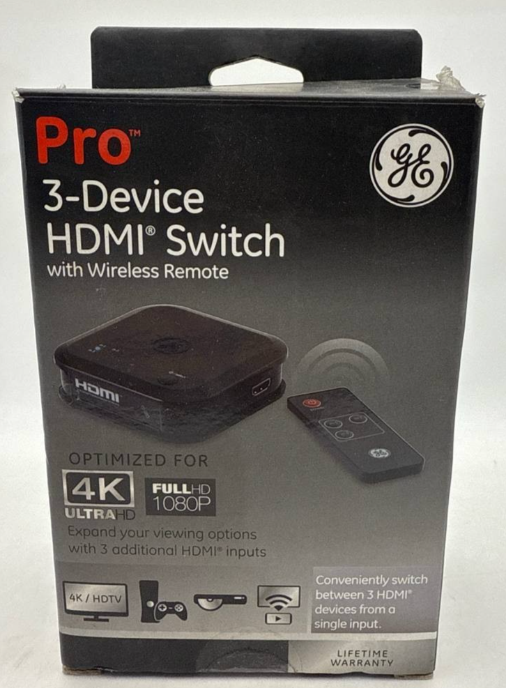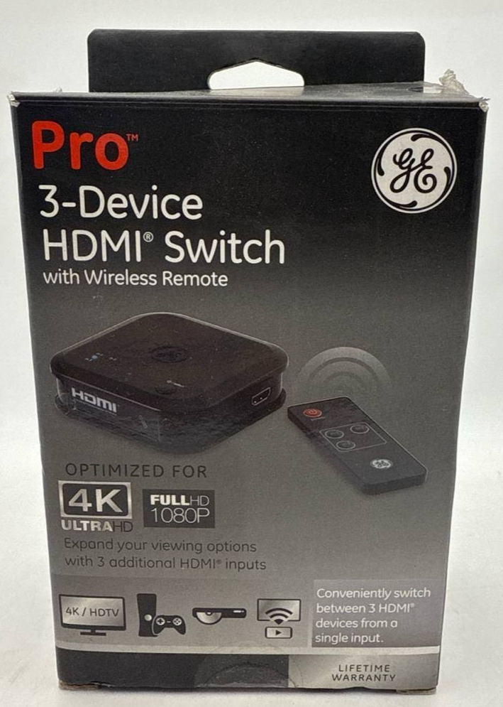 GE Black HDMI Switch 3 Port 4K Ultra HD Auto Selector Hub with Wireless Remote