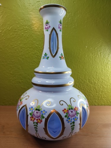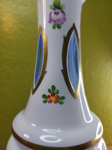 Beautiful opaline cased glass overlay antique decanter on sea water blue Bohemian crystal, grounded and highlighted with hand painted flower garlands and decorations in whimsical filigreed bouquets of various miniature roses and other flora. The design of the decanter curls and scrolls in pure gold, for style and design referable to the Moser way.