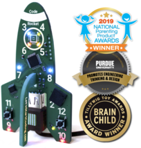 Blast into coding with Code Rocket! Girls and boys aged 8 to 12 can learn coding through this rocket-shaped circuit board. Code Rocket is equipped with eight LED lights, a speaker, and two buttons that are controlled with code. Using a computer and Code Rocket, kids learn how computer programming can control physical objects and get immediate feedback from the rocket that they can code!