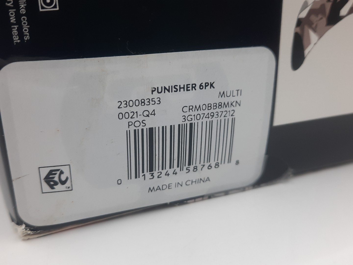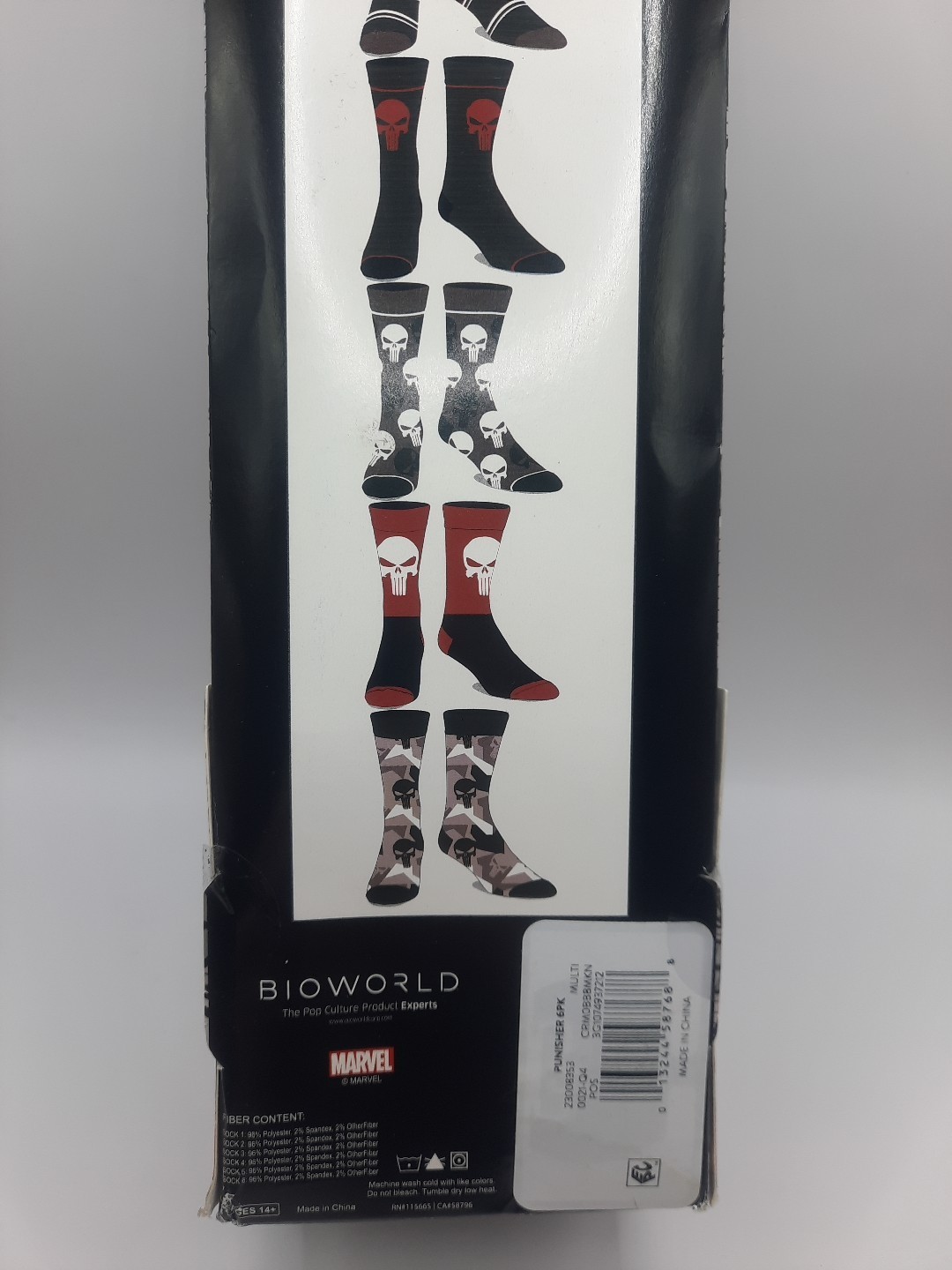 This product is a set of 6 pairs of men's crew socks featuring the iconic Punisher character from Marvel Comics. The socks are machine washable and made of a blend of 2% spandex, 96% polyester, and 2% other fibers. They come in a multicolored design with the Punisher logo, making them perfect for casual wear during the fall season. These novelty socks are great for fans of the Punisher and add a touch of personality to any outfit with their unique style and theme.