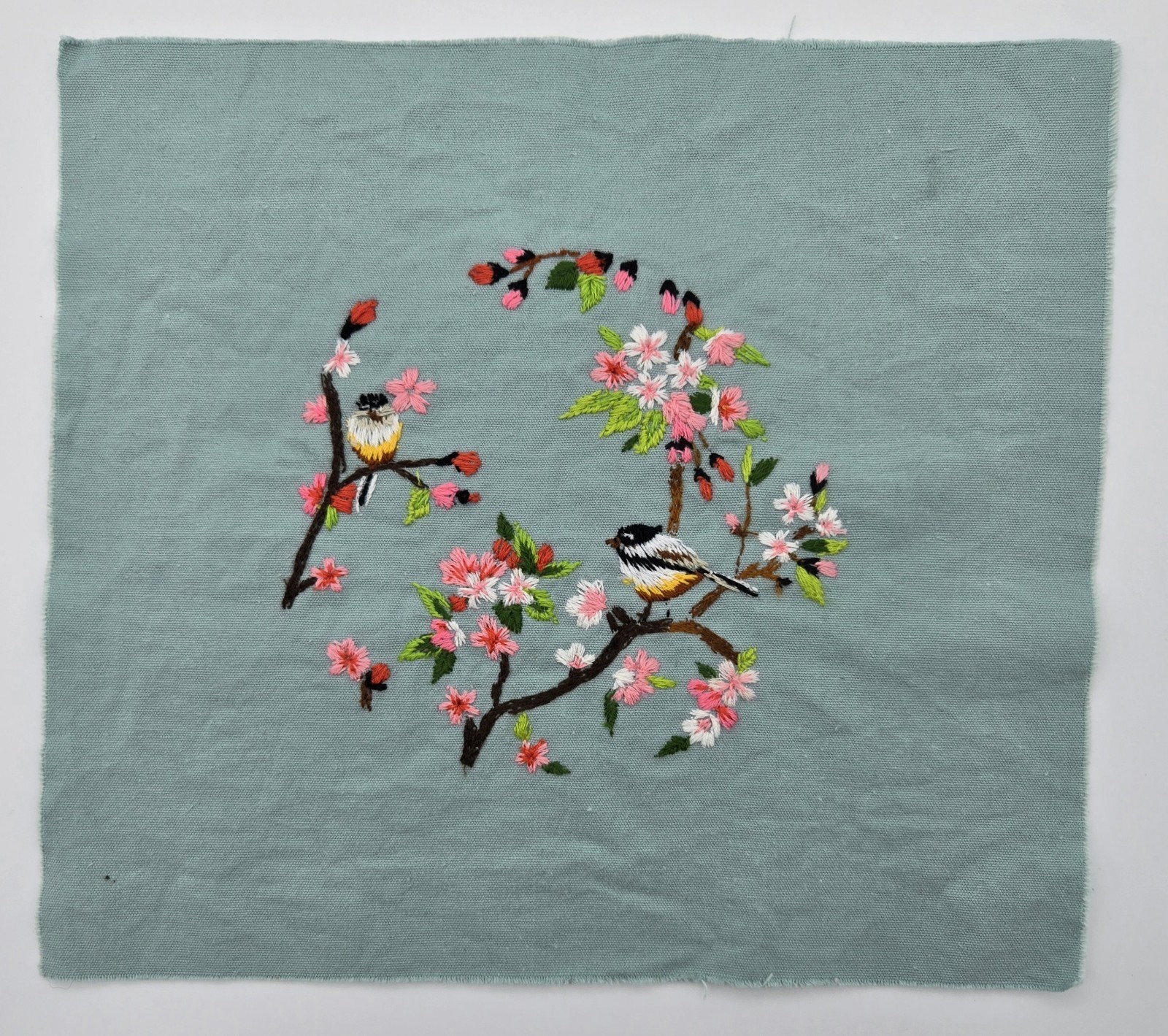 Charming vintage textile art featuring a songbird and cherry blossom embroidery on a green background with white, black, red, pink, and brown tones ? a lovely handmade piece for framing or display.