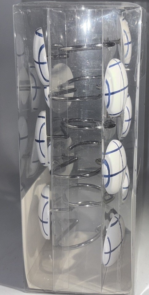 The Sparrowhawk Set of 12 Shower Curtain Hooks in Ensign Blue and White is a stylish and functional addition to any bathroom. Made from durable resin, these hooks feature a matte finish and are designed to securely hold your shower curtain in place. With a pack of 12 hooks included in the set, you'll have plenty to outfit your bathroom with a classic and elegant look. Perfect for use in showers, these hooks from Sparrowhawk International will add a touch of sophistication to your bathing experience.