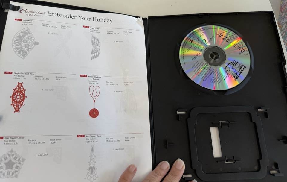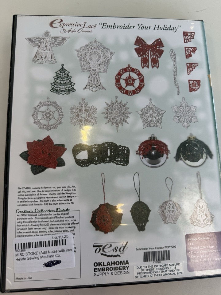 The product is an OESD Embroidery Design Card #797 featuring holiday lace designs by Marie Osmond. This unit includes one design card specifically tailored for embroidery enthusiasts looking to add festive and intricate lace patterns to their projects. Perfect for those who enjoy working with embroidery machines and creating handmade crafts, this design card offers a variety of creative possibilities for adding a touch of holiday charm to various fabric items.