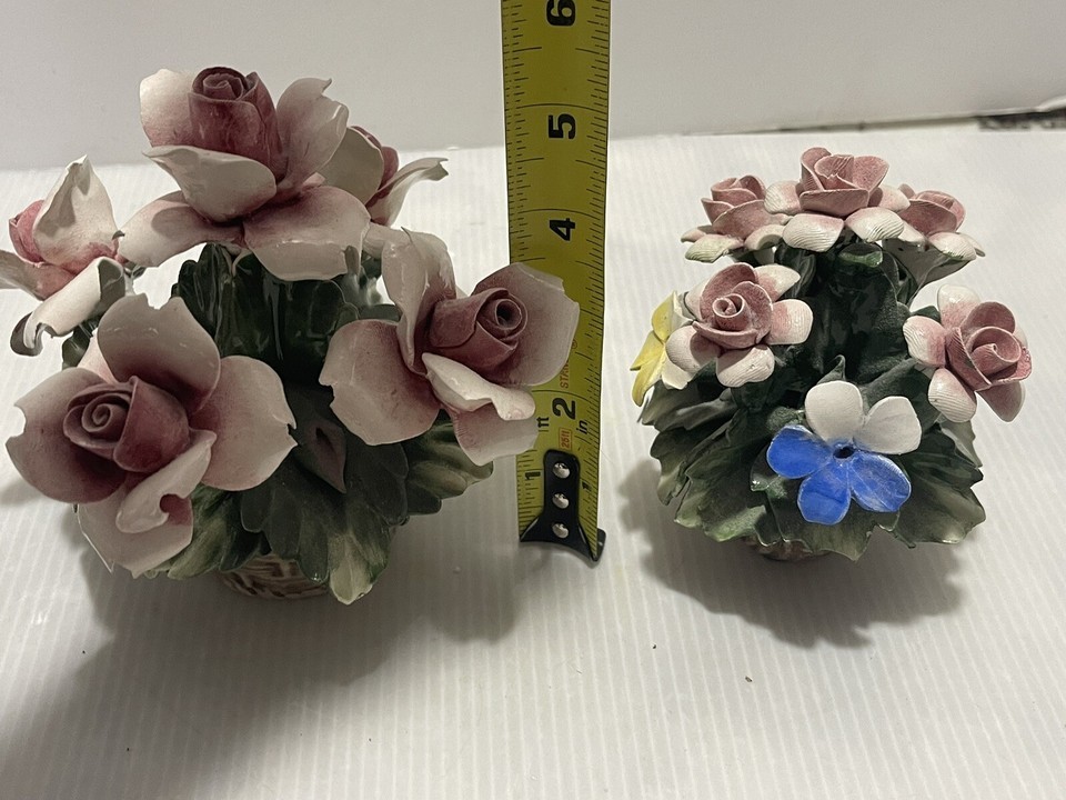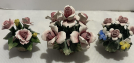 Vintage 3pc Porcelain Capodimonte Flower Floral Pink, Yellow and Blue Flowers. 5 1/2" tall and the other 2 4" all in Brown base basket.