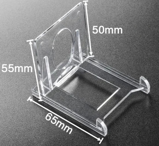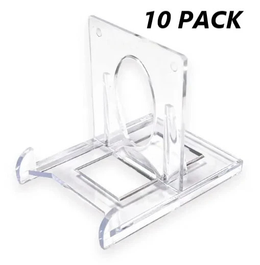 The product is a set of 10 clear acrylic trading card stands, designed specifically for standard-sized sports cards. These stands are suitable for graded cards and are manufactured in China. The transparent color of the stands allows the cards to be easily visible for display purposes. Perfect for sports trading card collectors looking for a stylish and practical way to hold and display their cards.