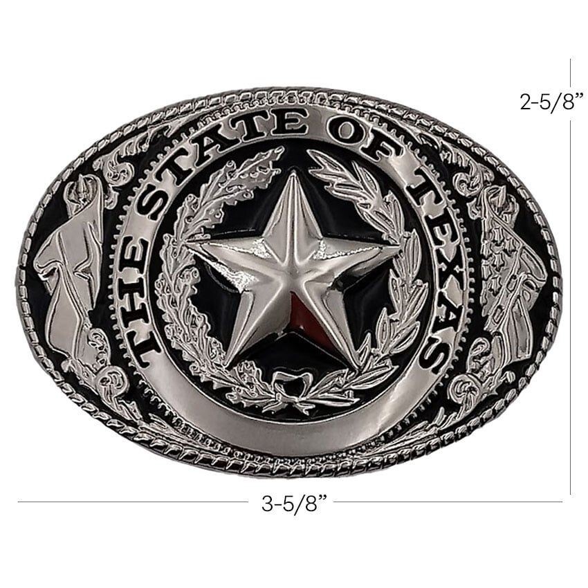 Show off your love for the Lone Star State with this stunning Texas State Silver Metal Belt Buckle. The oval buckle features intricate detailing and a silver finish that will add a touch of Western charm to any outfit. The buckle fits a 1.5 inch belt and is perfect for jeans or pants.