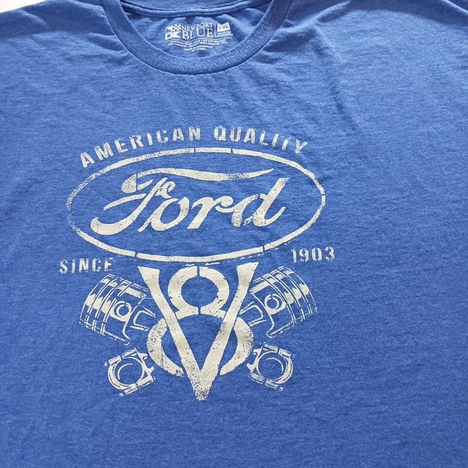 Show your love for classic cars with this Newport Men's Blue American Quality Ford V8 T-Shirt. This comfortable and stylish short sleeve crew neck shirt is made of a cotton/polyester blend and is available in size 2XL. The solid blue color perfectly complements the vintage car theme, which features a bold V8 graphic on the front. This shirt is perfect for any Ford or car enthusiast, whether you're going out for a drive or hanging out with friends.