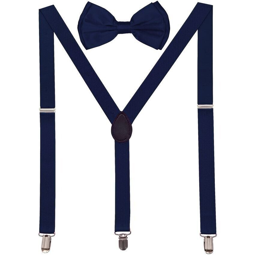 Add a touch of sophistication to your outfit with these navy blue suspenders and matching polyester bowtie. Designed for men, the elastic band ensures a comfortable fit while the clip attachment type securely fastens to your pants. The suspenders are made of high-quality polyester material and come in one size, making them suitable for most individuals. Perfect for formal occasions or adding flair to your everyday look, these suspenders and bowtie are a stylish addition to any wardrobe.