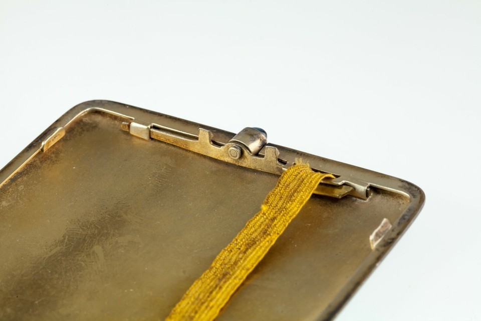 800 Silver German Hammered Cigarette Case w/ Blue Sapphire Cabochon Clasp 135.9g
