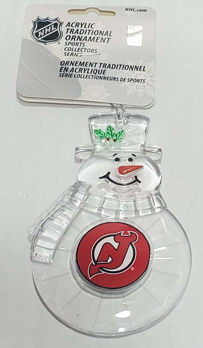 Officially Licensed New Jersey Devils Acrylic Snowman Ornament.