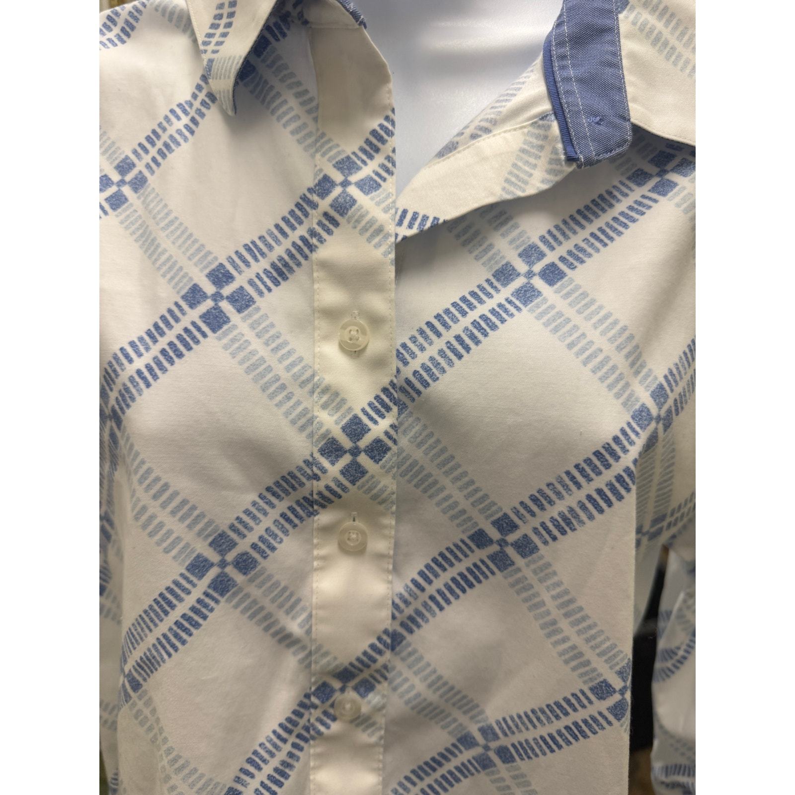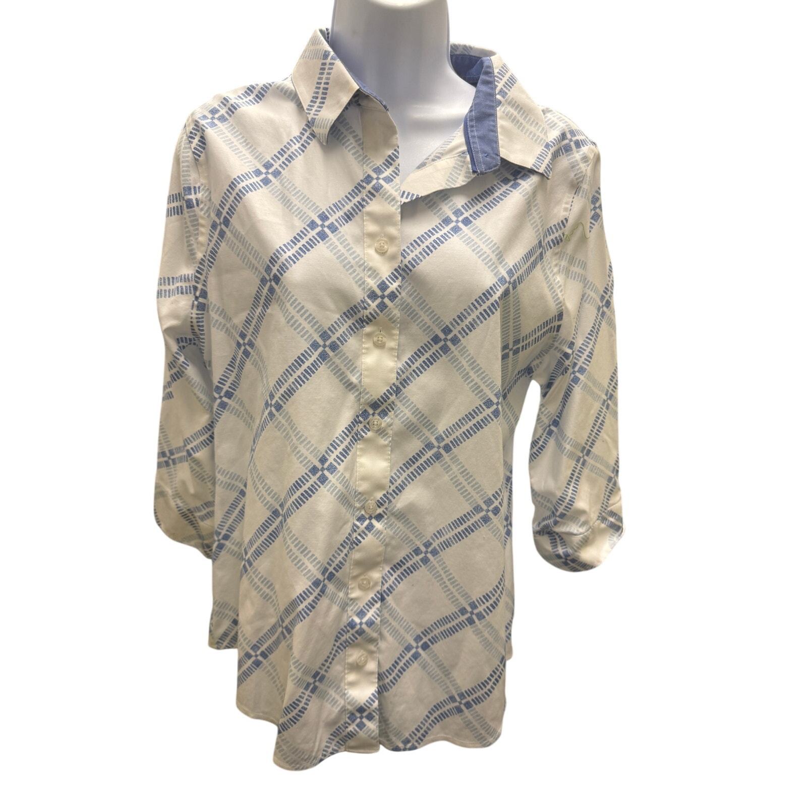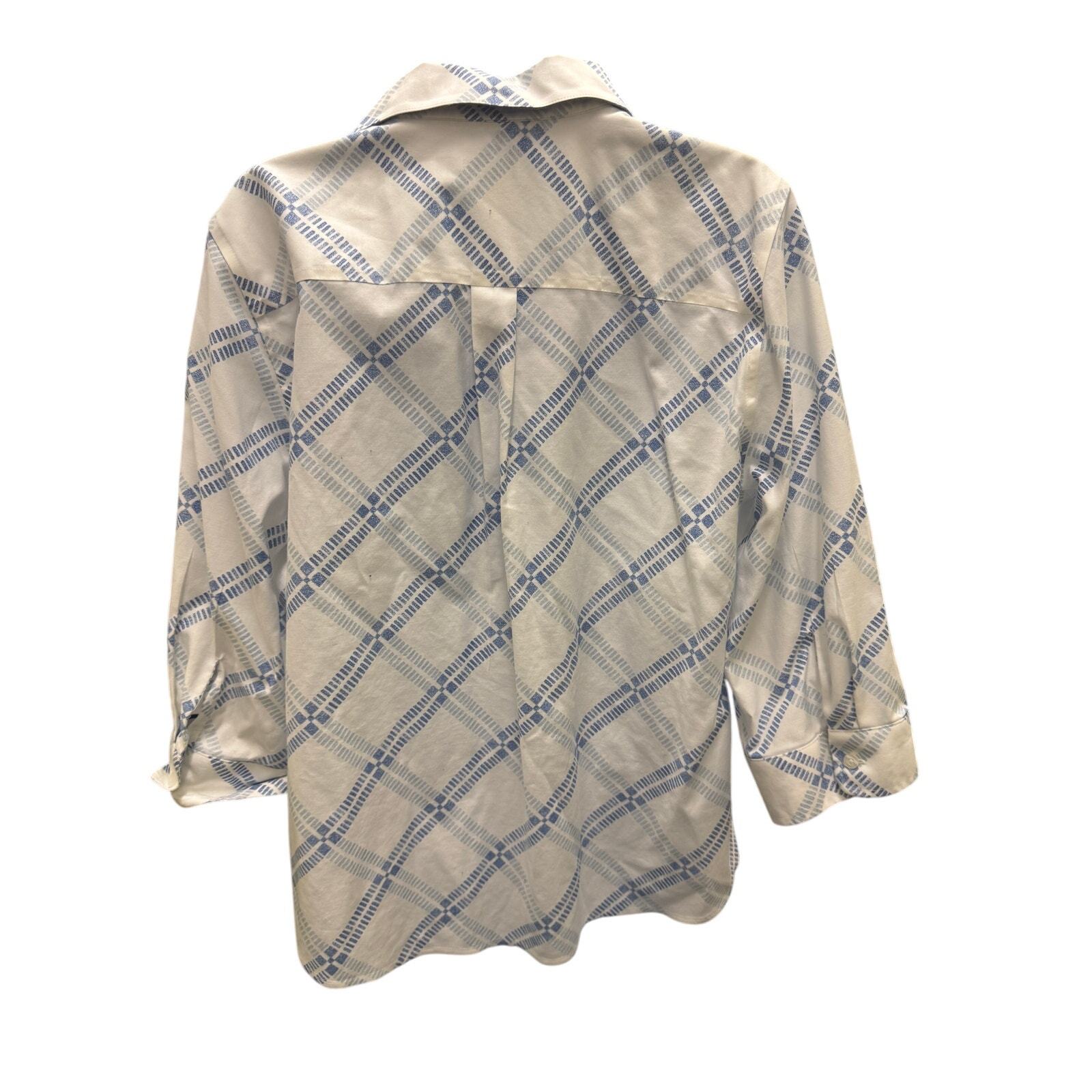 Chico's No-Iron Effortless Womens 2 12 Large Blue Stripe Top 3/4 Sleeve White