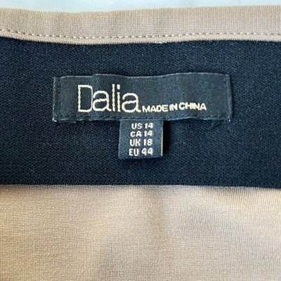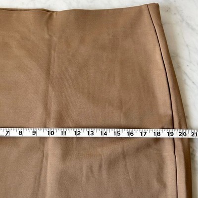 Dalia women's size 14 mid-length pull-on skirt. Butterscotch brown knit a-line skirt. 68% Rayon, 27% Nylon, 5% Spandex; Machine Wash. Measurements in photos.