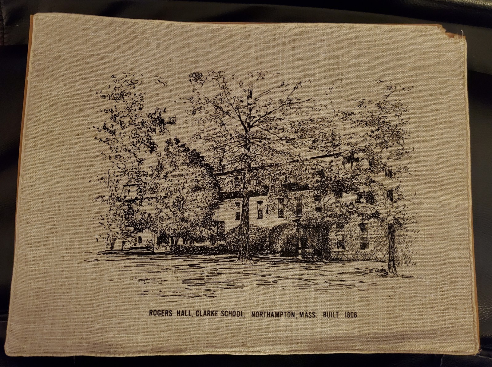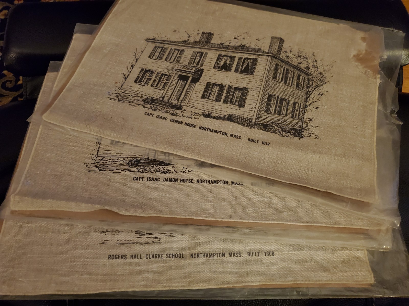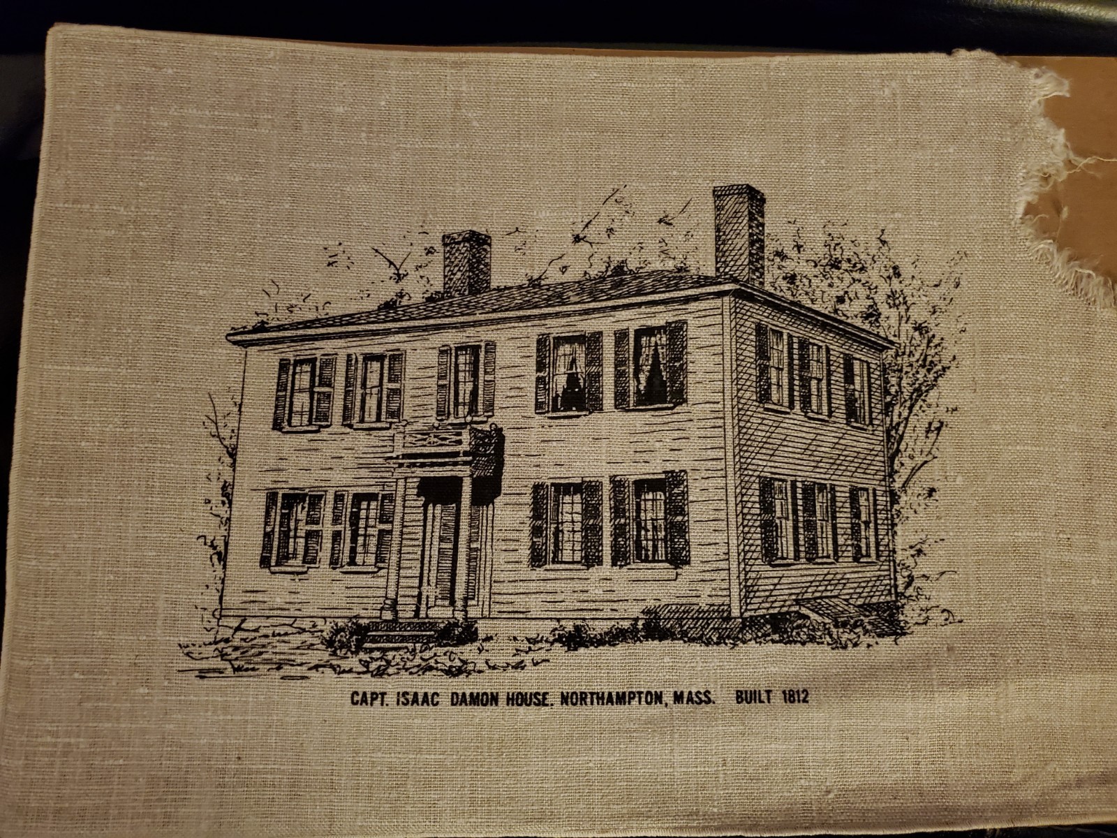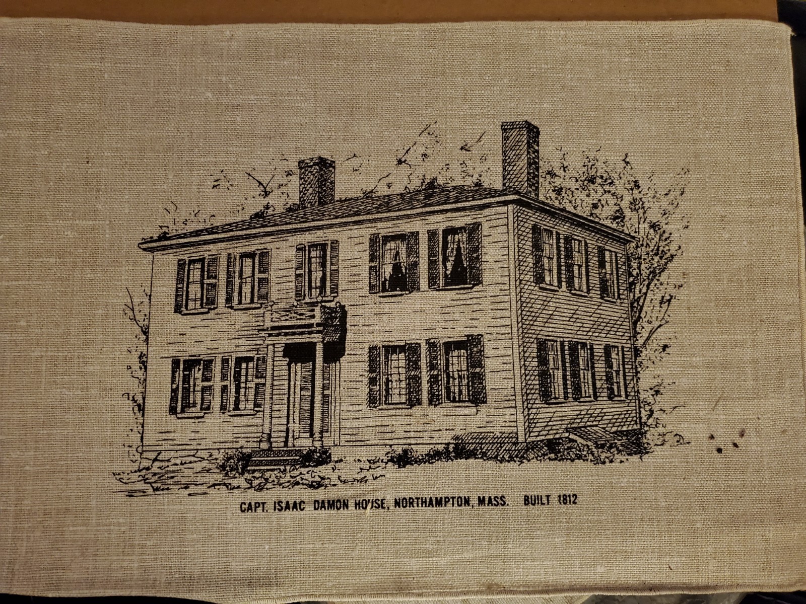Three linen placements of historical locations in Northampton MA. Two of the three are of the Captain Issac Damon House. Two of the three have damaged corners.