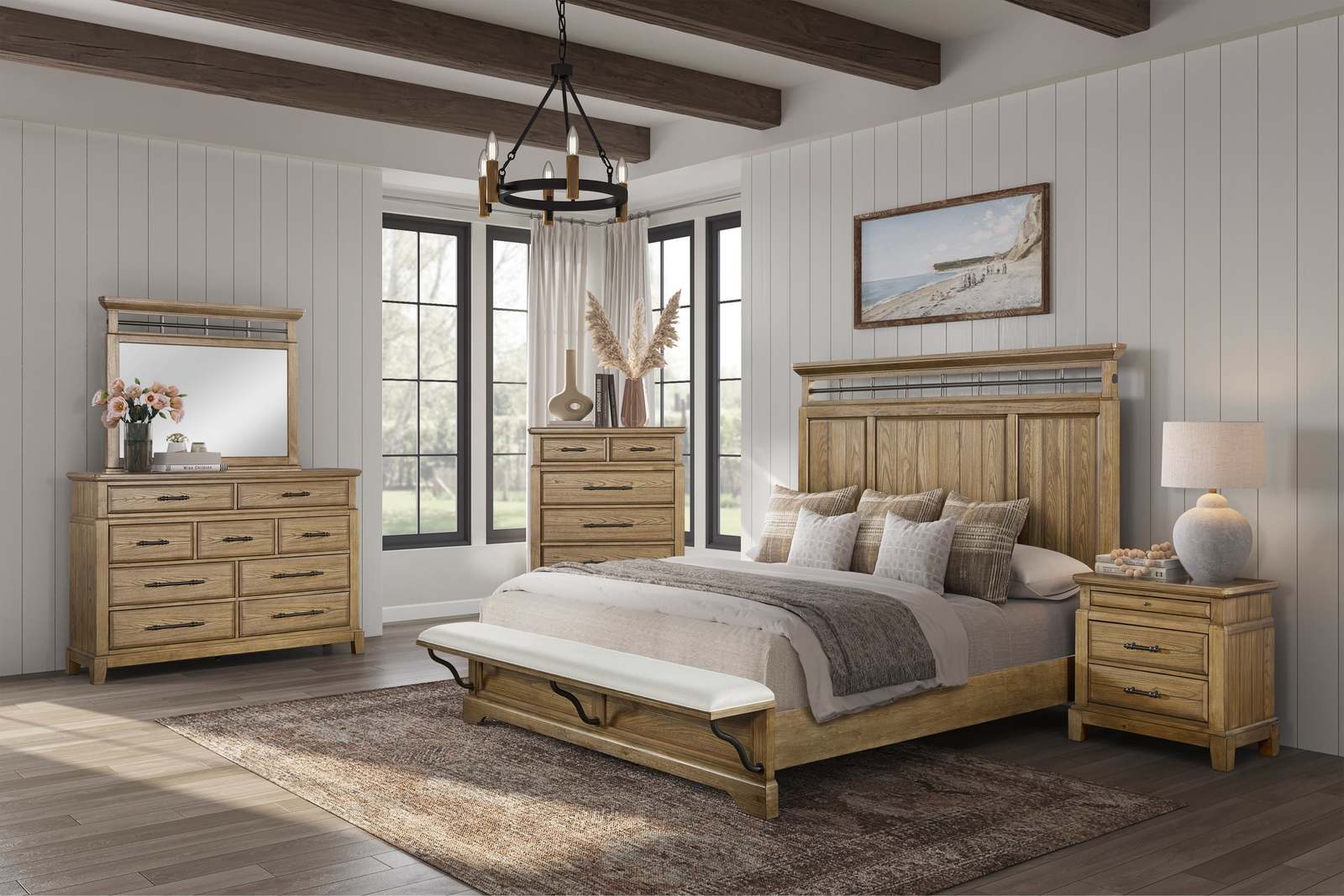 The piece is equipped with industrial-inspired hardware, featuring bold, dark metal bar pulls that contrast beautifully with the elm finish and add a touch of industrial character