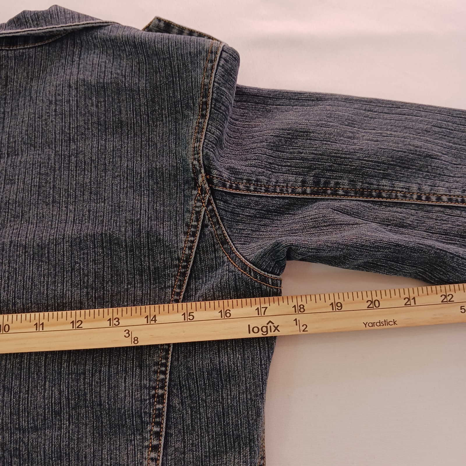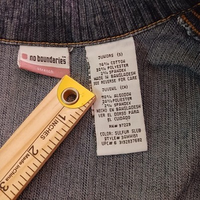 The No Boundaries Stretch 34WW151 Juniors Size S Black Cotton Blend Belted Jacket is a stylish denim jacket perfect for teens. Made from a cotton blend fabric with a solid black color, this jacket features long sleeves and a button closure. The belted design adds a trendy touch, while the stretch feature ensures a comfortable fit. With a 19-inch length, this jacket is ideal for fall and spring seasons, making it a versatile and fashionable addition to any wardrobe.