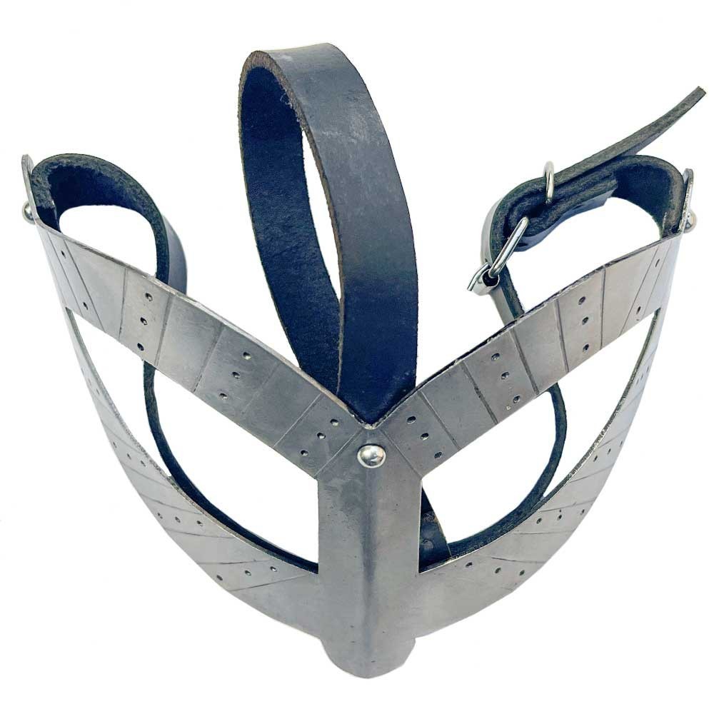 This mask is constructed of hand forged 18 gauge mild steel. Each piece has been painstaking crafted using traditional hand forged methods. Strap it on to your head with 2 genuine leather straps and lock it into place with the buckle which can be adjusted to different size.
