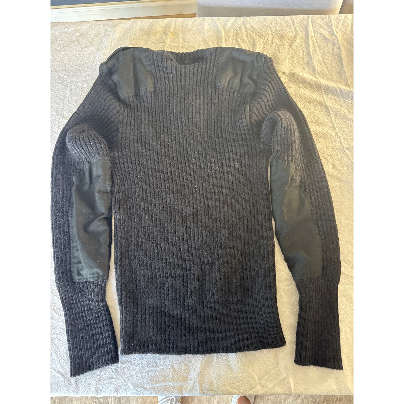 Features include reinforced cotton shoulder and elbow patches, ribbed knit construction, and a classic V-neckline. Known for its durability and warmth, this style was worn by military and police personnel across the UK.