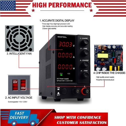 Wanptek adjustable DC power supply 30V 10A 230V 50/60 Hz WPS3010H - Open Box. Shipped with USPS Ground Advantage.