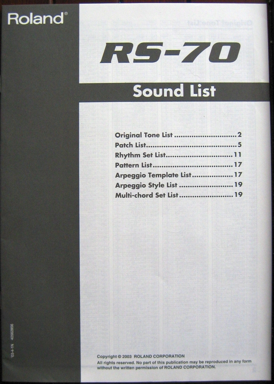Roland RS-70 Digital Synthesizer Keyboard Original Sound List Booklet Manual