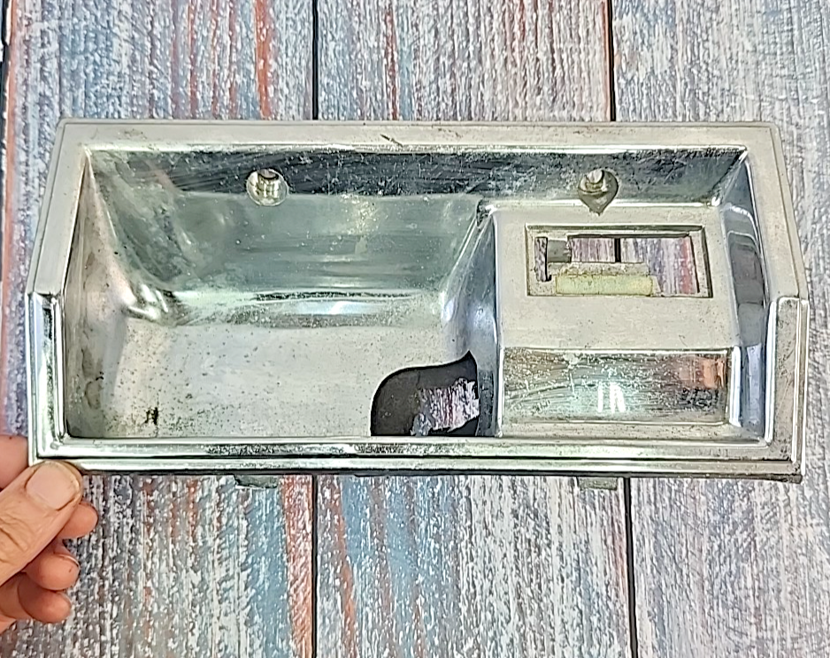 Exact item is shown. Vintage used item. Chromed plastic, finish in good condition with some light wear. Black door handle grommet is worn, as shown. Made in USA. Please review our business policies in our store for information regarding returns, shipping and warranties.