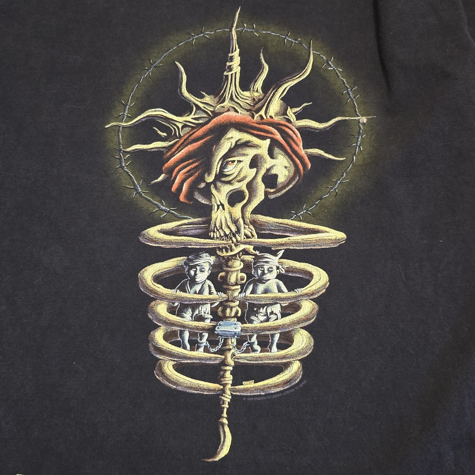 This shirt celebrates Megadeth?s iconic Youthanasia era, released after Countdown to Extinction, and showcases their shift toward melodic yet heavy metal dominance. The striking design features vivid gold, orange, and bone tones on a black cotton base that?s naturally faded with age for perfect vintage patina.