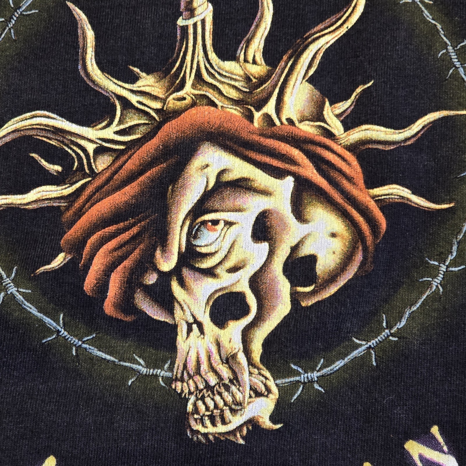 Original 1995 Megadeth ?Youthanasia? North American Tour T-shirt featuring the album?s skeletal figure artwork on front and full tour city list on back. Printed on authentic Giant tag ? one of the most collectible blanks for 1990s metal tees.