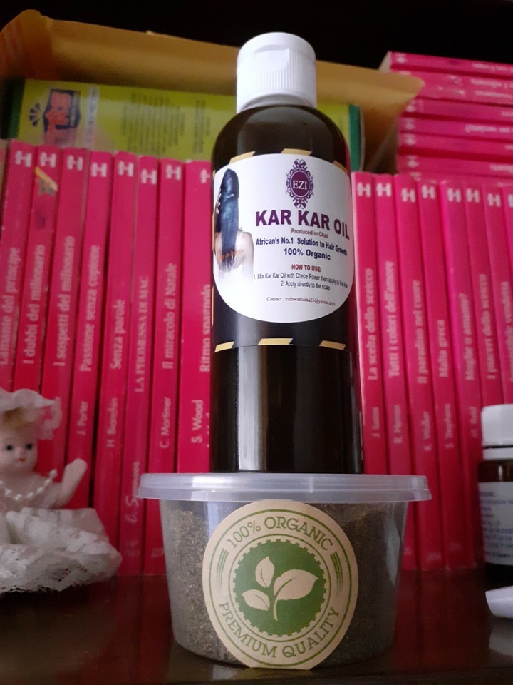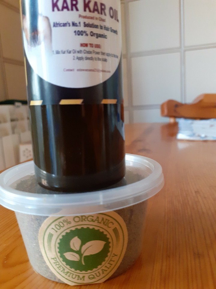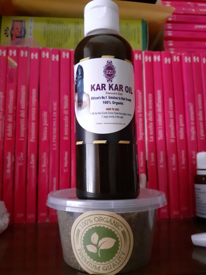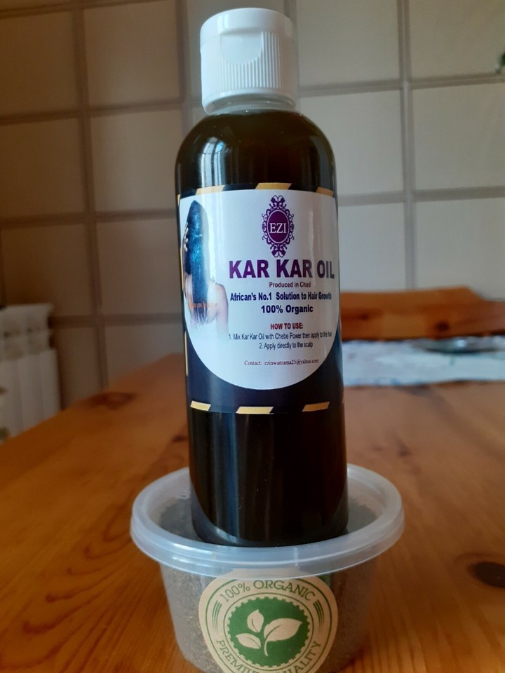 Once you mix Karkar Oil to the Chebe powder, You have a very potent mixture which when used in your regimen will promote longer healthier hair growth. ... This mixture will in essence lock in moisture to dry damaged hair and impart all those vitamins and nutrients from the Chebe Powder into the hair shaft and hair follicles.